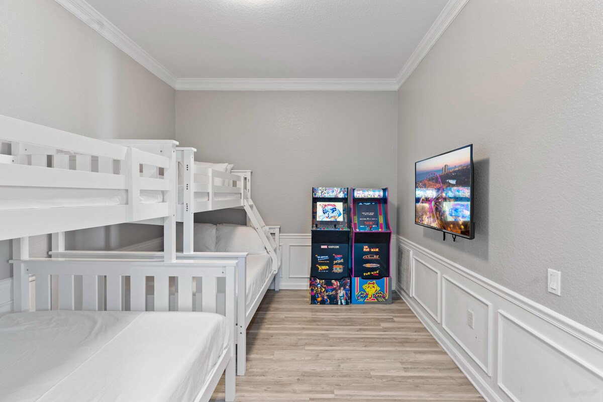 The second bedroom also features a king-size bed, while the third offers two double-size beds, perfect for accommodating more guests. The fourth bedroom is ideal for kids, equipped with two single-over-double bunk beds, arcade games, and its own 55” Roku TV.