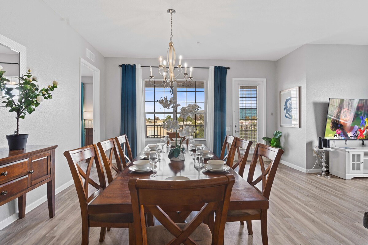 Step into a grand living room featuring a 75” smart TV, ideal for movie nights or streaming your favorite shows. The open layout creates a welcoming atmosphere for relaxation, while the dining area comfortably seats eight, offering the perfect setting for family meals or game nights.