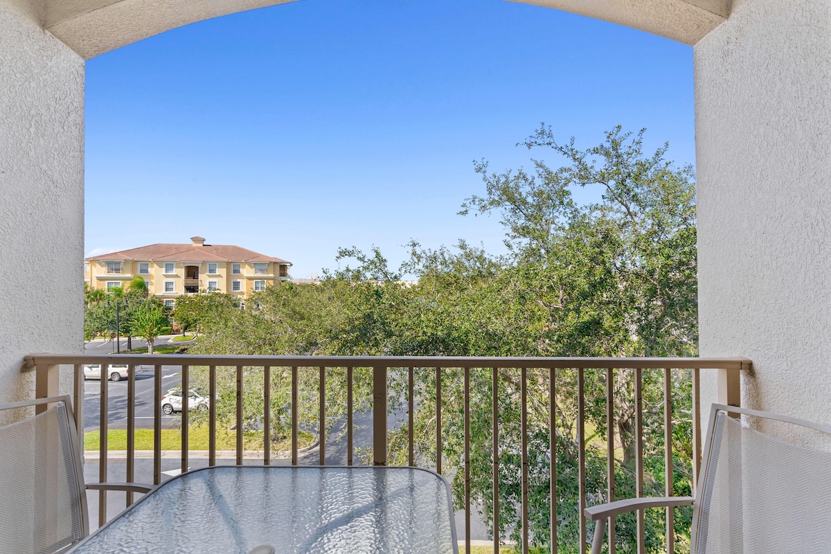 Step out onto the charming balcony to enjoy the beautiful Florida sunshine. This peaceful outdoor space is perfect for savoring a morning coffee or unwinding in the evening with a cool drink. With serene views of the resort, it's the ideal spot for relaxation amidst the vibrant energy of Orlando.