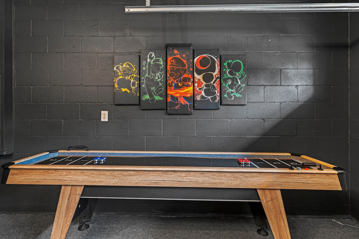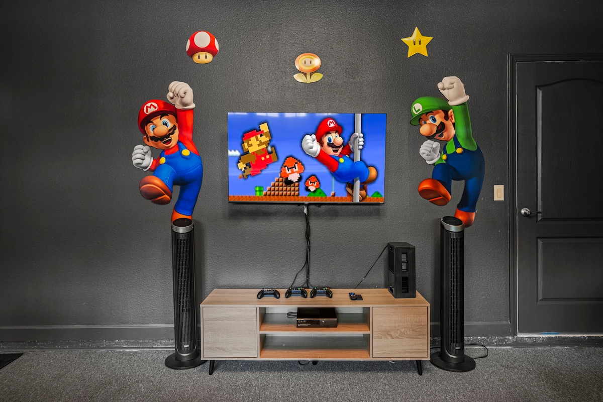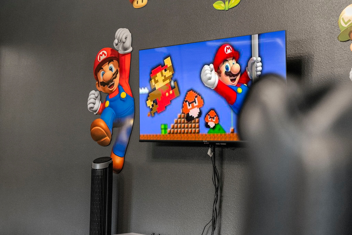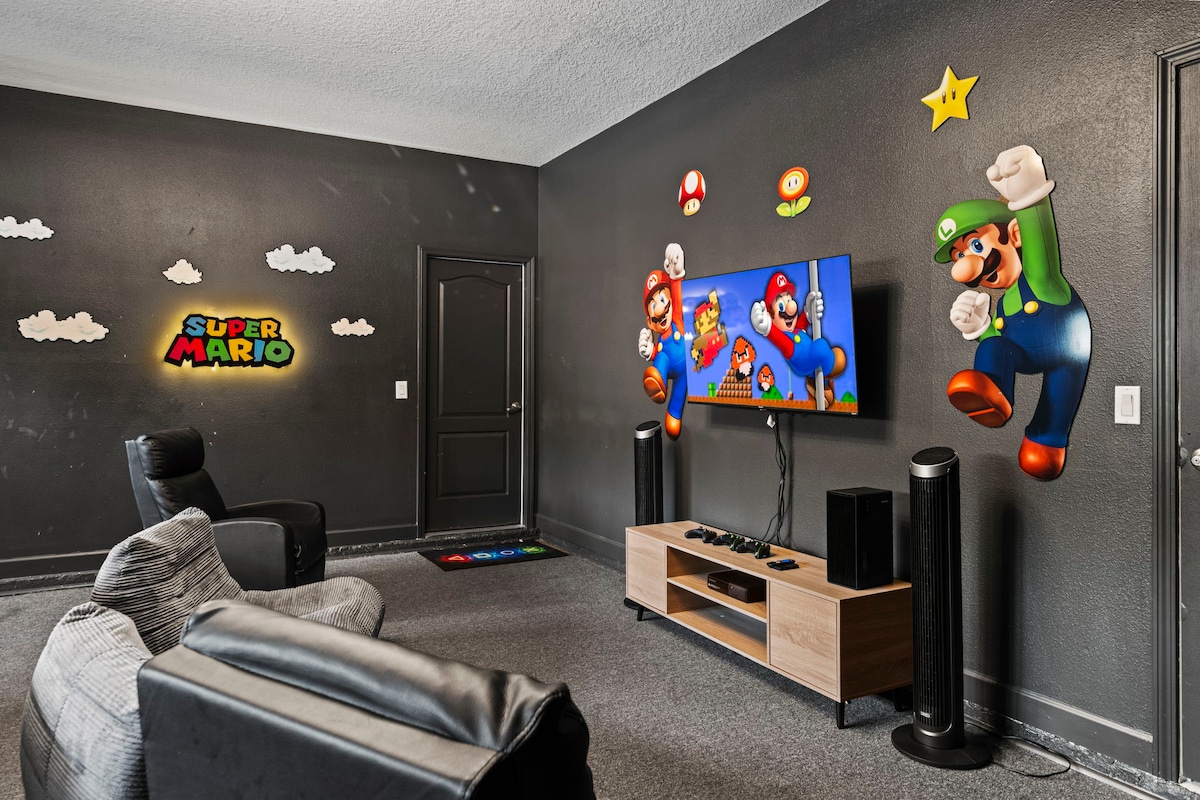 What used to be a basic garage is now a Super Mario-themed game room packed with fun — designed in-house with custom wall decals, bright energy, and games like air hockey and foosball. It’s a highlight for kids and nostalgic adults alike.