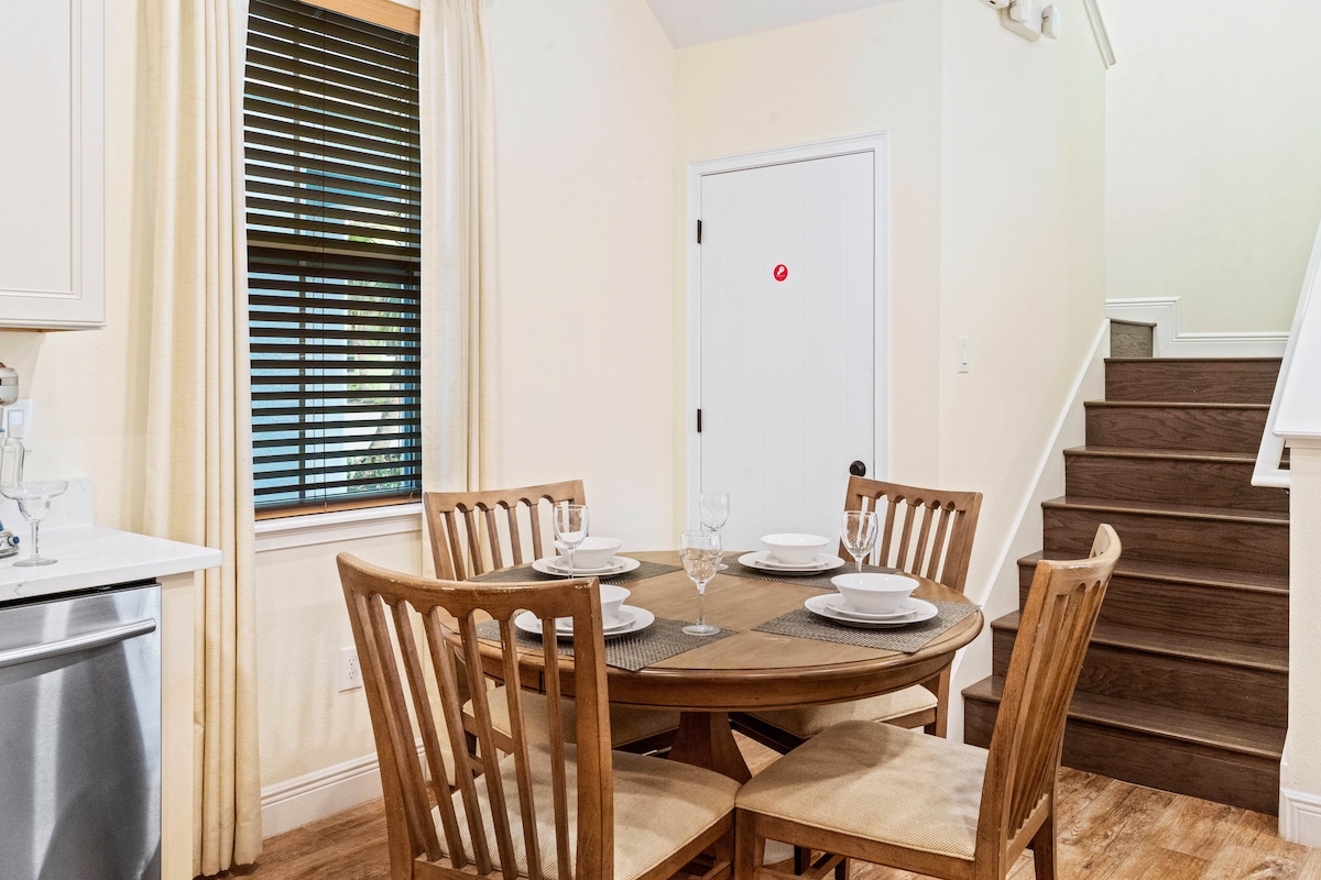 The cottage features a sleek, fully stocked kitchen complete with stainless steel appliances, ample counter space, modern cabinetry, and all the cookware you need. Whether you're preparing breakfast before heading out or cooking dinner at home, the adjoining dining area comfortably seats four and is ideal for family meals or casual dining.