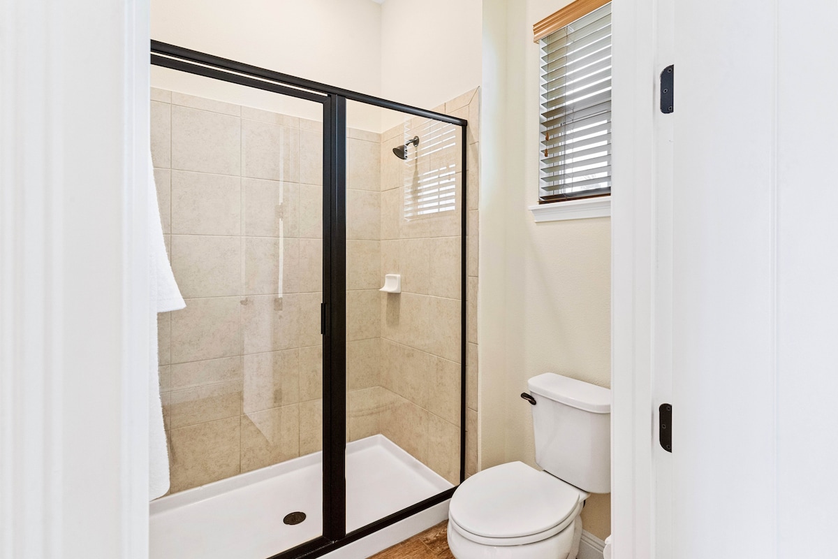 The primary suite offers a rustic king-size bed, matching nightstands, a ceiling fan, and serene decor for ultimate relaxation. The en-suite bathroom features a spacious walk-in shower with glass doors, providing a spa-like experience ideal for decompressing after theme park thrills.