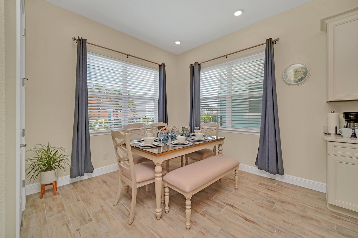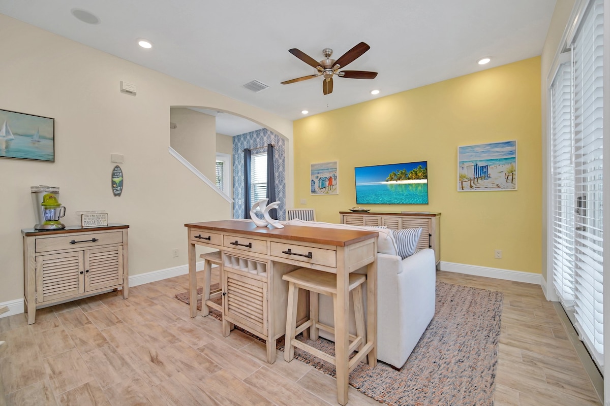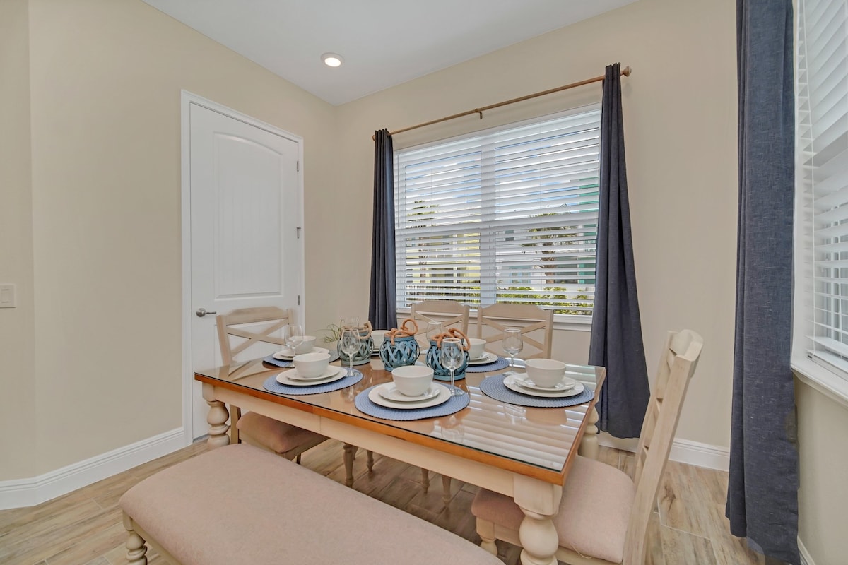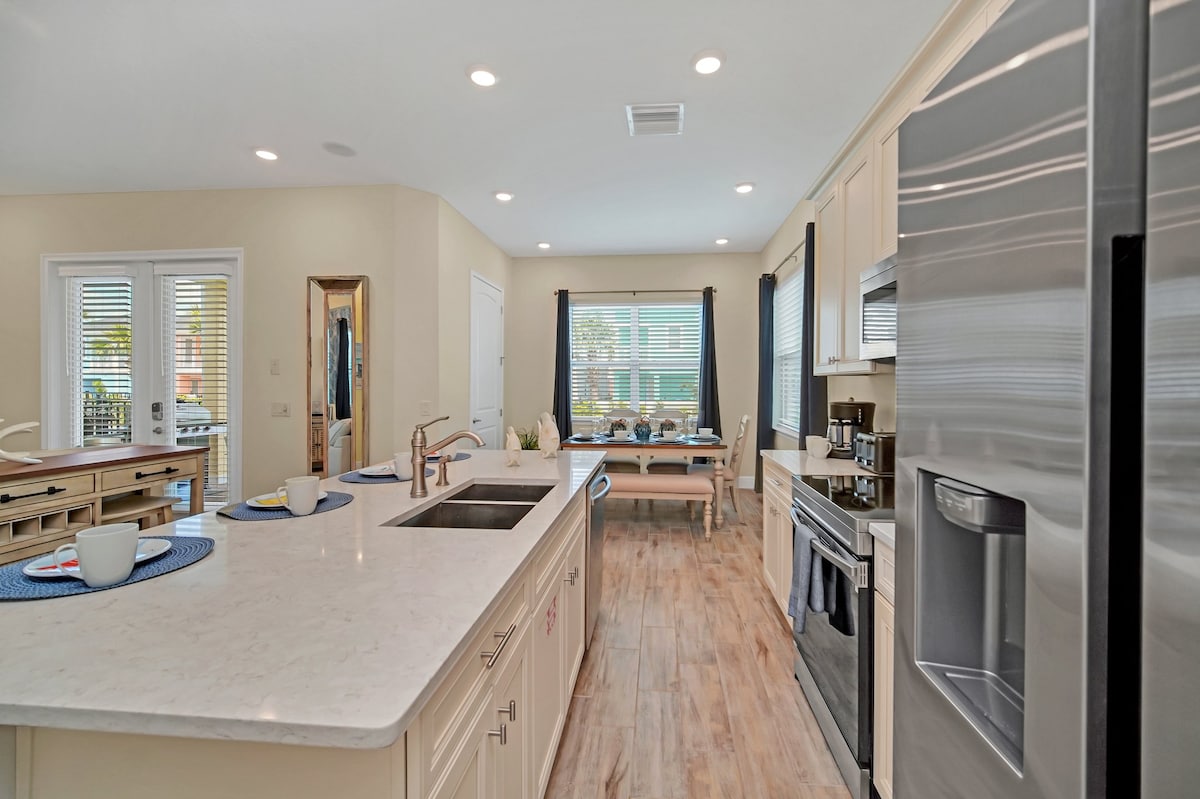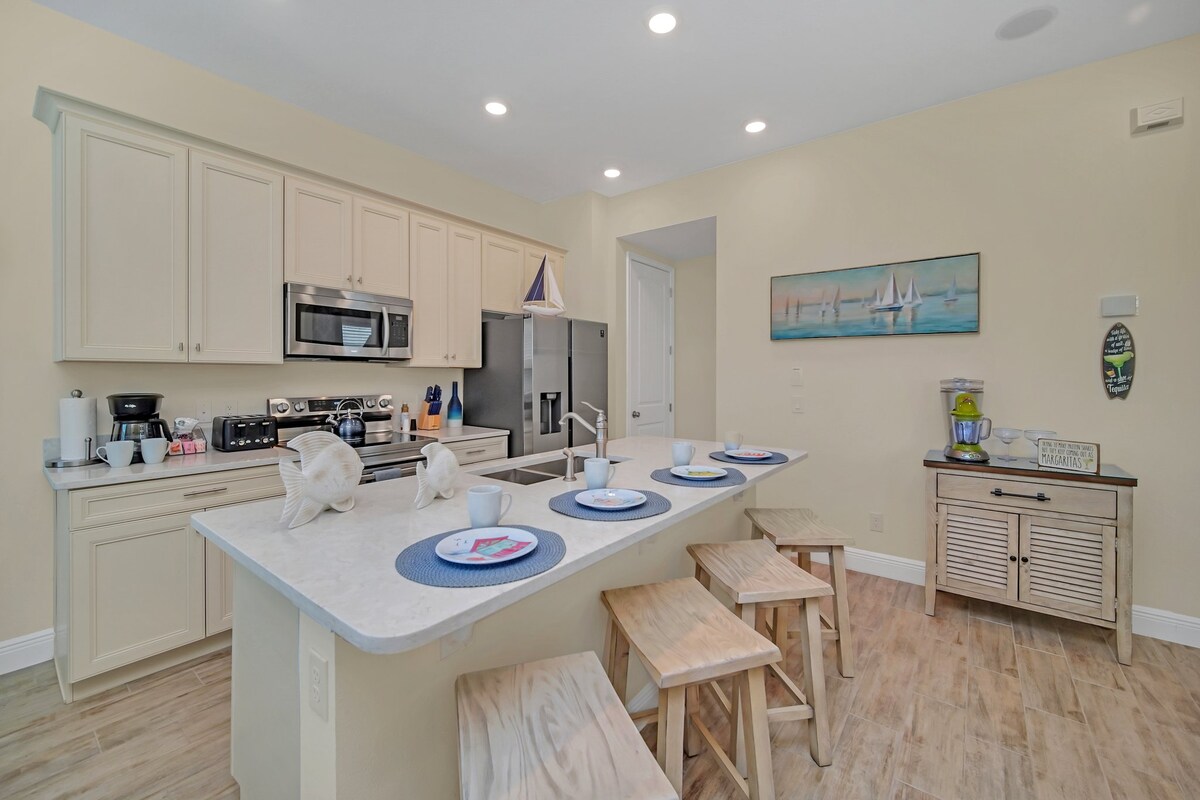 Cook with ease in the fully equipped kitchen which features stainless-steel appliances, pristine cabinetry, and a center island that doubles as a breakfast bar. Whether you’re preparing a family meal or enjoying a quick snack, the kitchen has everything you need for a delightful dining experience.