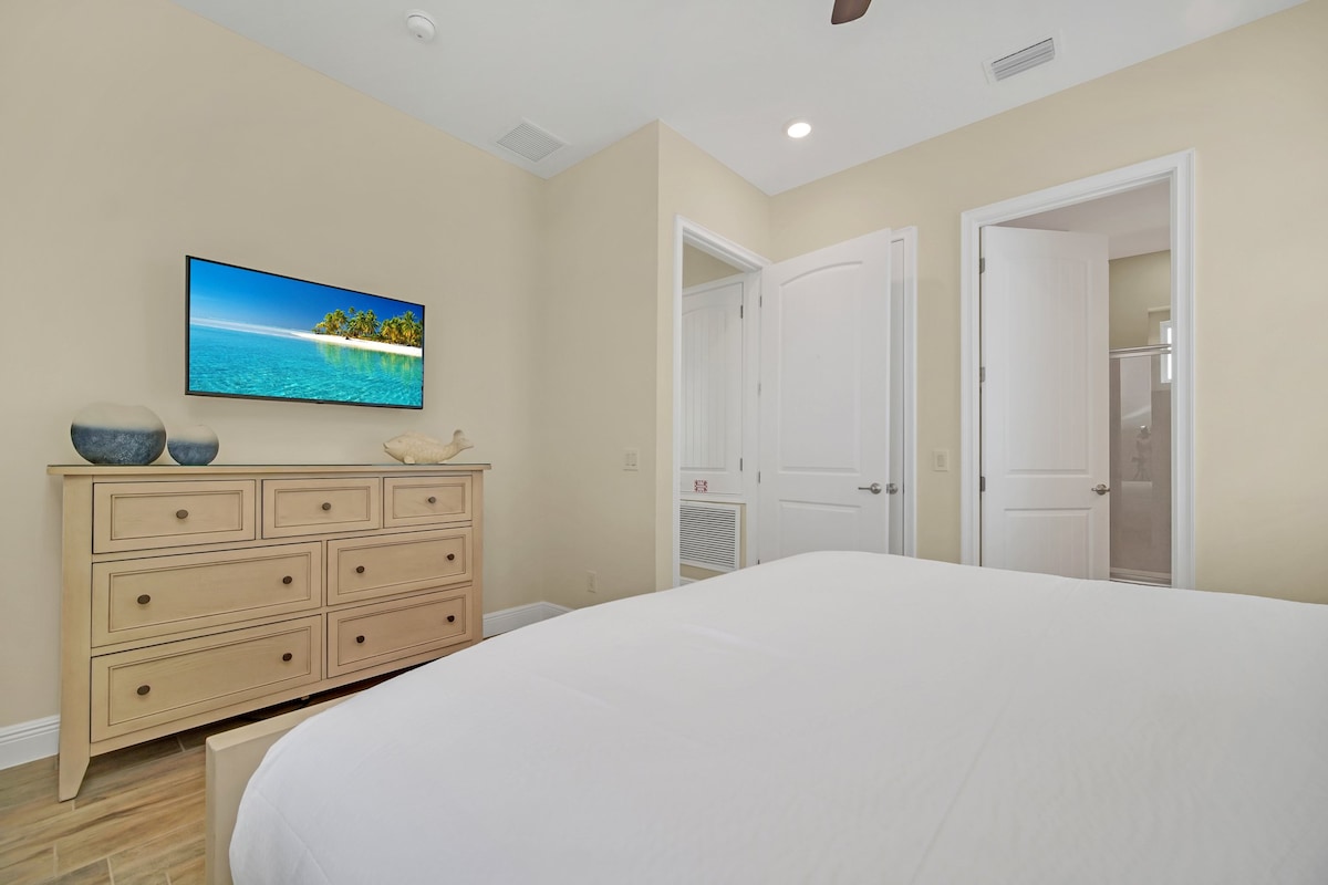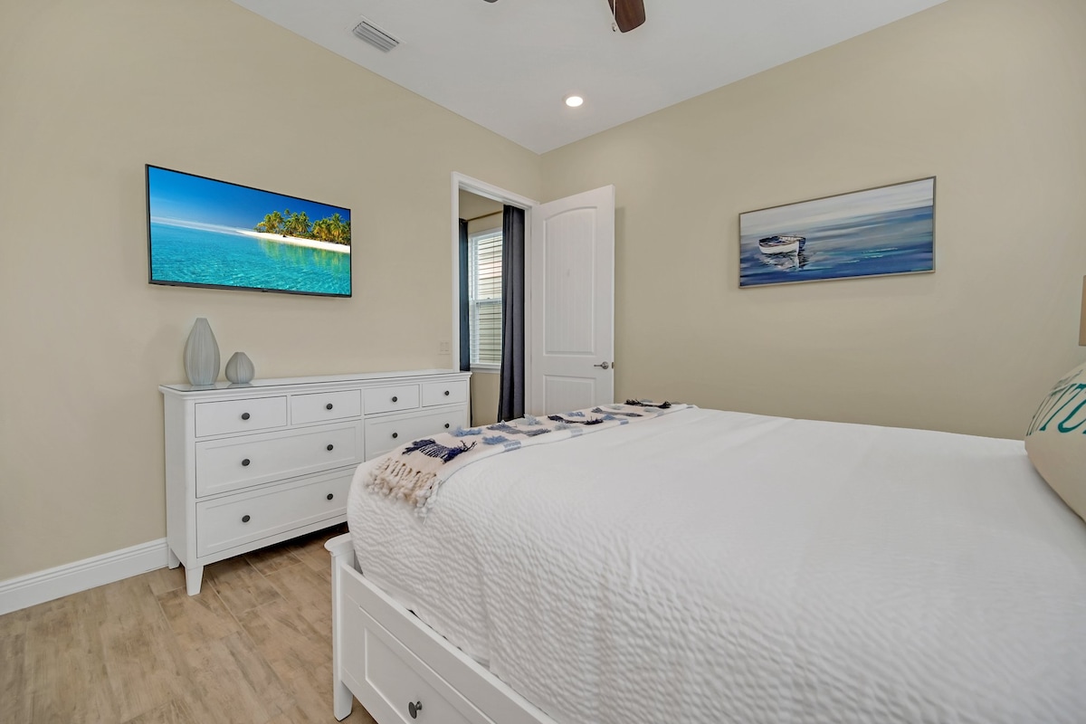 Relax in the charming den adorned with nautical-inspired décor and a farmhouse-style entertainment center. With an additional flat-screen TV, this cozy space is perfect for quiet evenings or sharing stories of the day’s adventures.