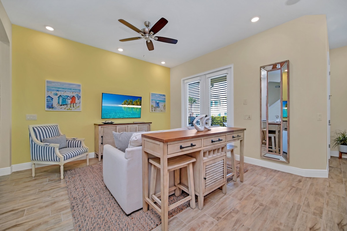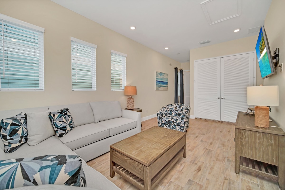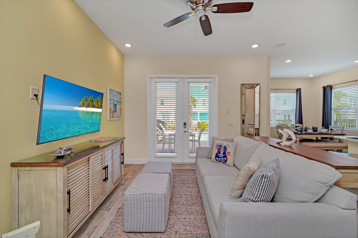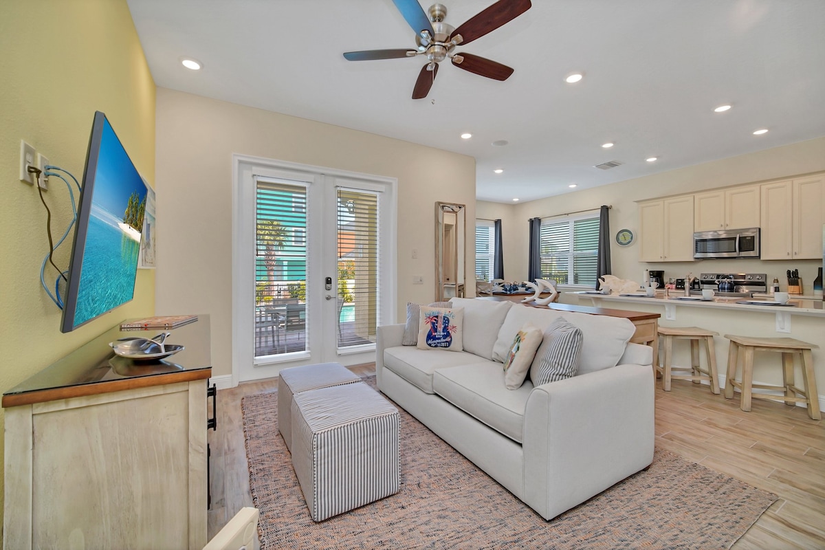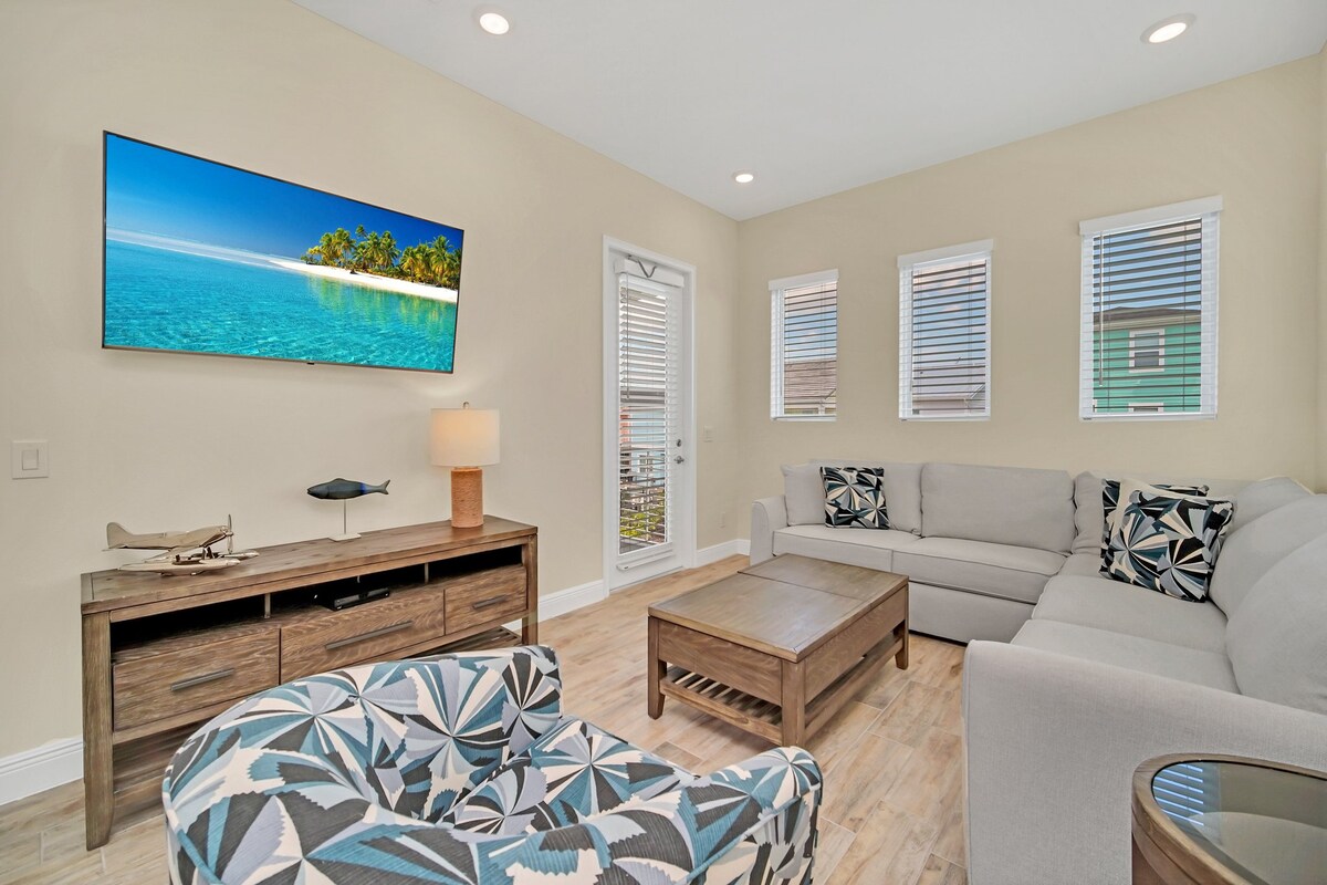 The spacious, open-plan living area is perfect for unwinding after a fun-filled day. Featuring a wraparound sectional, guest seating, and a large flat-screen TV, this welcoming space is ideal for family gatherings, cozy movie nights, or simply relaxing in style.