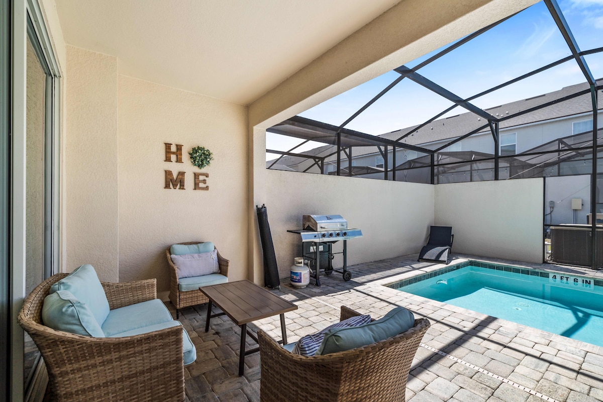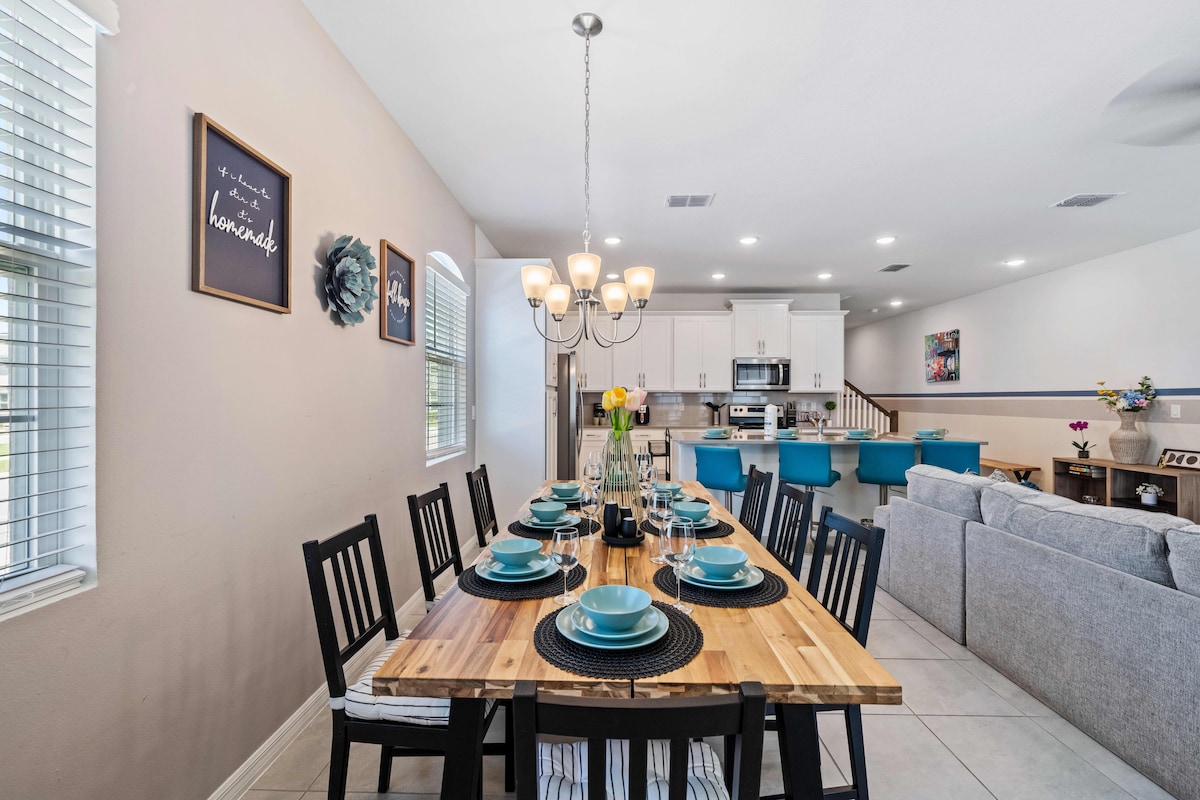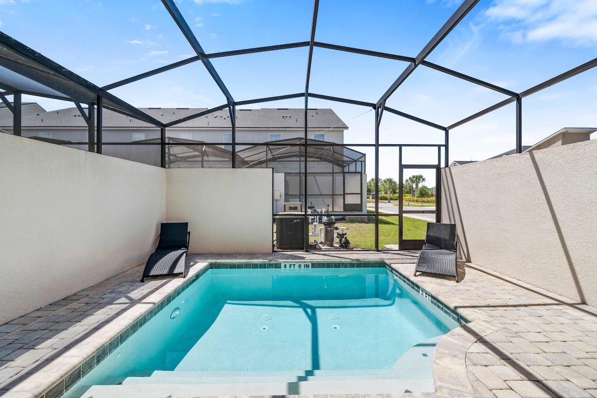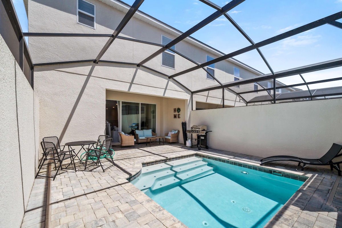 Step outside to your private pool and patio, where relaxation awaits. Lounge on the sun loungers, take a refreshing swim, or enjoy a barbecue on the provided outdoor grill. The outdoor furniture offers a cozy space to soak up the Florida sunshine or enjoy family meals alfresco. This serene setting is your personal backyard paradise.