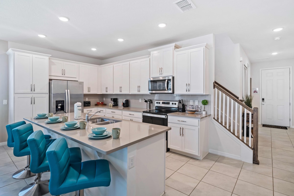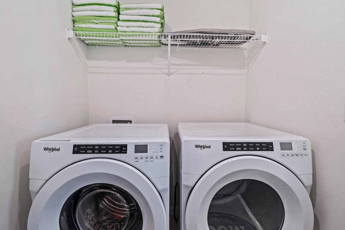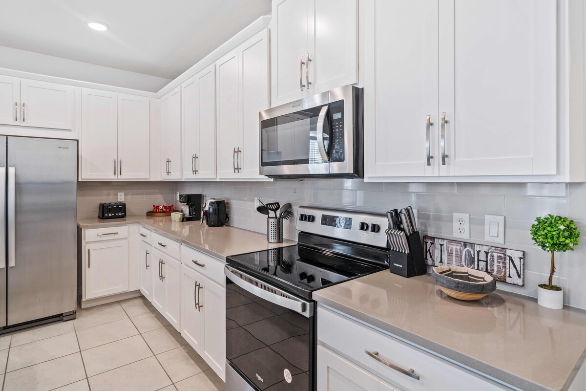 Cooking is a breeze in the home’s fully equipped kitchen, which features stainless steel appliances, a fridge, and all essential cookware, pots, pans, and condiments. Prepare delicious meals or snacks and gather around the dining table for a family dinner. For casual mornings, the breakfast bar is perfect for coffee and quick bites before heading out for the day.