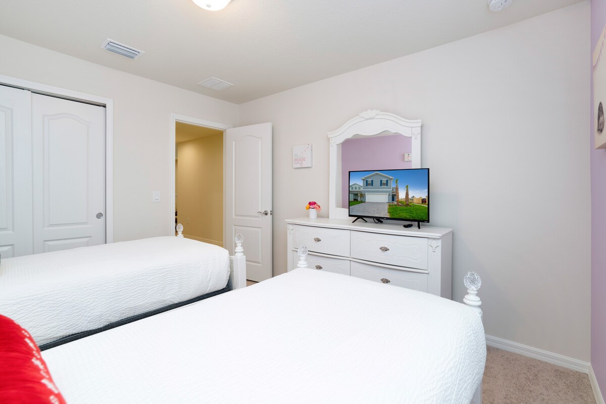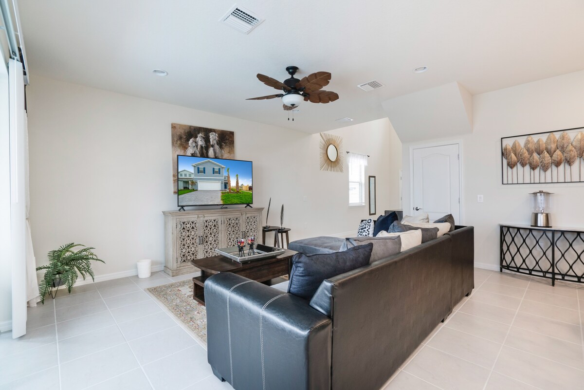 Discover your perfect getaway at Windsor at Westside Resort!This spacious 5-bedroom retreat is ideal for large groups, featuring a private pool with a screened lanai and a fun-packed game room with a pool table and foosball. It also boasts a fully equipped kitchen for home-cooked meals, kid-friendly play areas, and all the modern amenities like free WiFi, private parking, and a dedicated workspace. Located just minutes of drive from Disney and Universal, this home offers ultimate comfort and an unforgettable vacation experience.