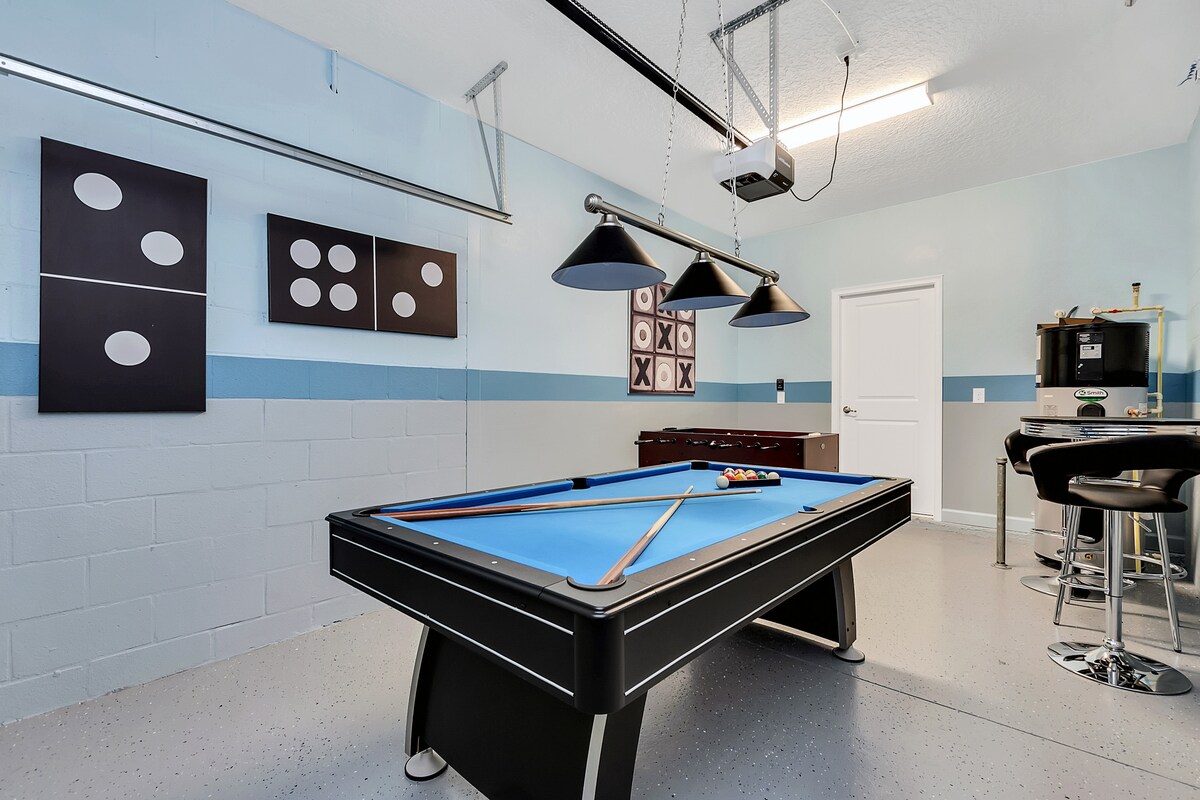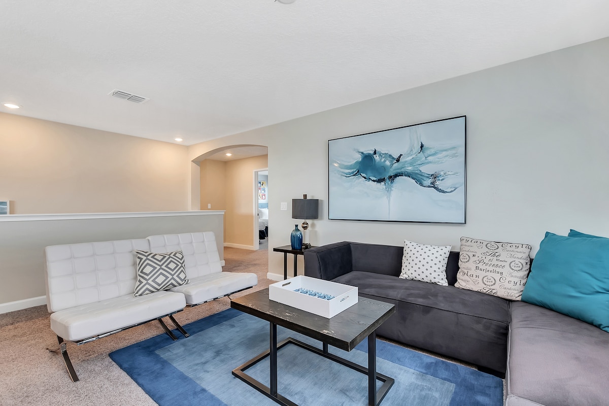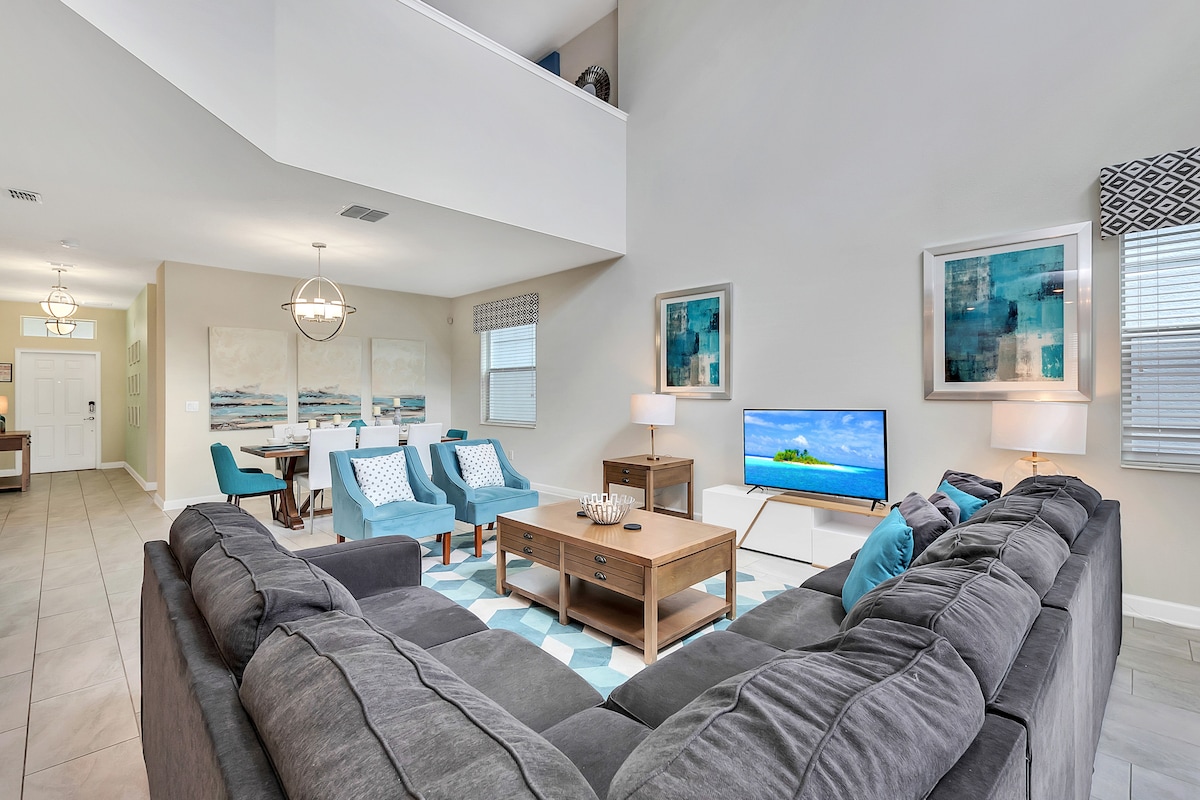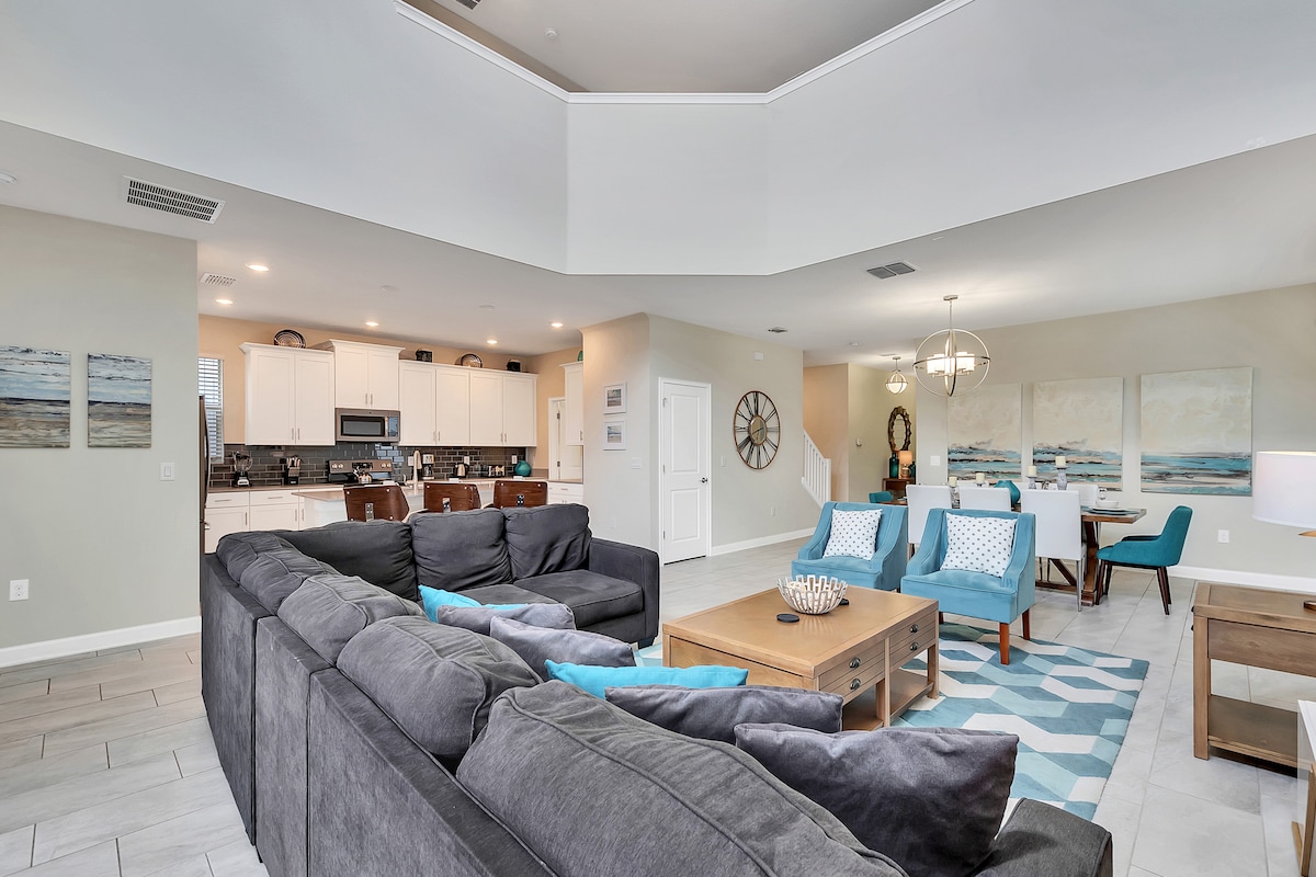 The living area provides a spacious and inviting atmosphere for relaxation. Enjoy family time or entertain guests in the welcoming living room equipped with comfortable seating and smart TVs. The dining area offers ample space for shared meals, complemented by entertainment options like a game room, ensuring fun for everyone.