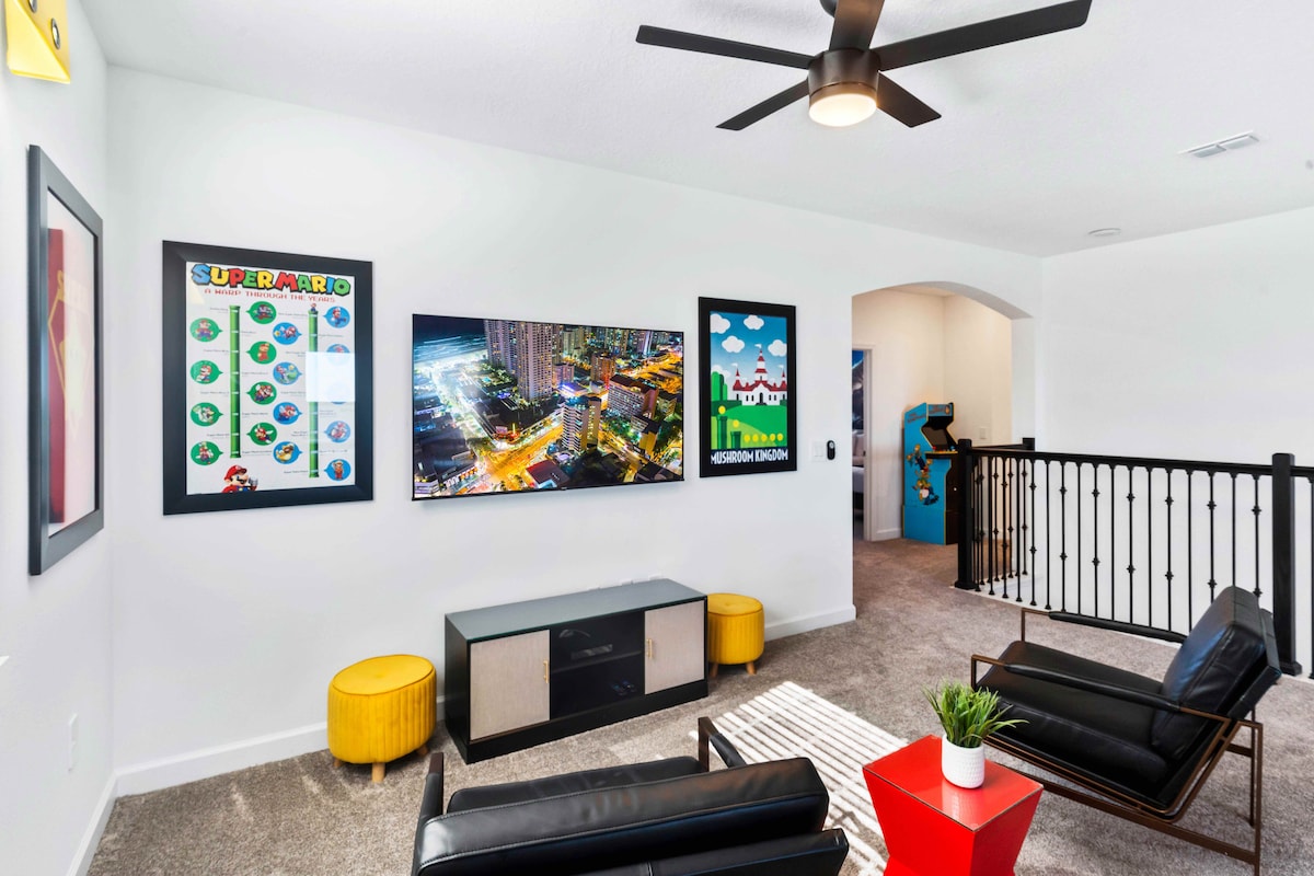 The entertainment loft area is the perfect space for additional relaxation or a cozy movie night. With a large Smart TV and comfortable seating, this area is ideal for unwinding after a day of adventures in Orlando.