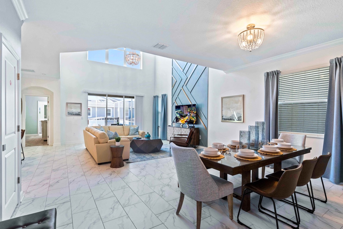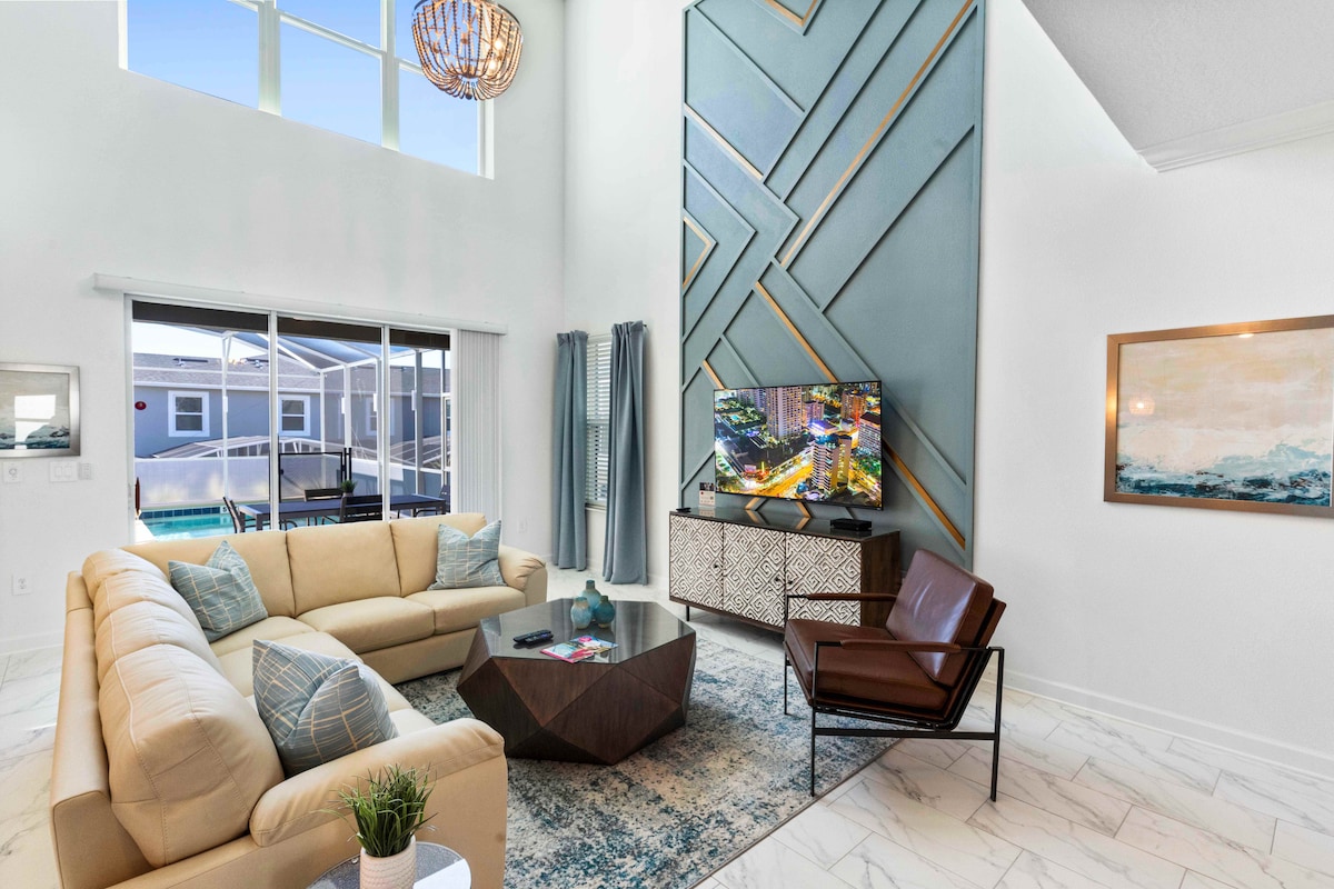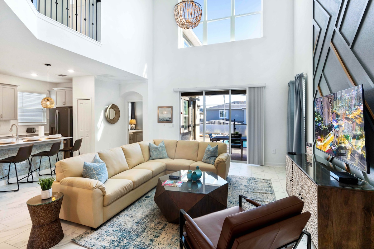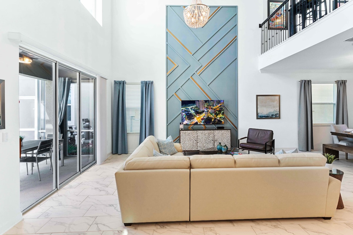 Step into the expansive living room, where high ceilings and luxurious décor create a welcoming atmosphere. A plush sectional invites you to sink in and enjoy your favorite shows on the large flat-screen Smart TV. Floor-to-ceiling sliding glass doors open up to your private outdoor oasis, blending indoor comfort with outdoor relaxation.