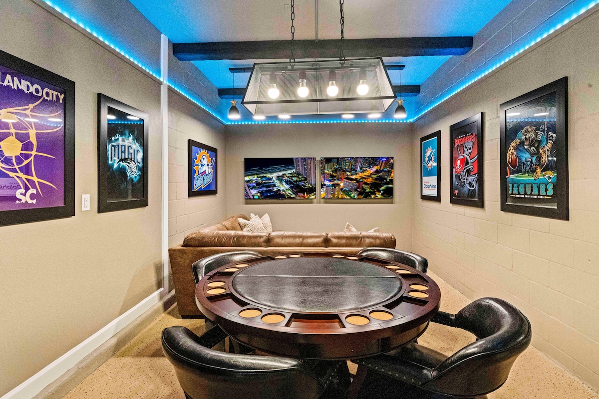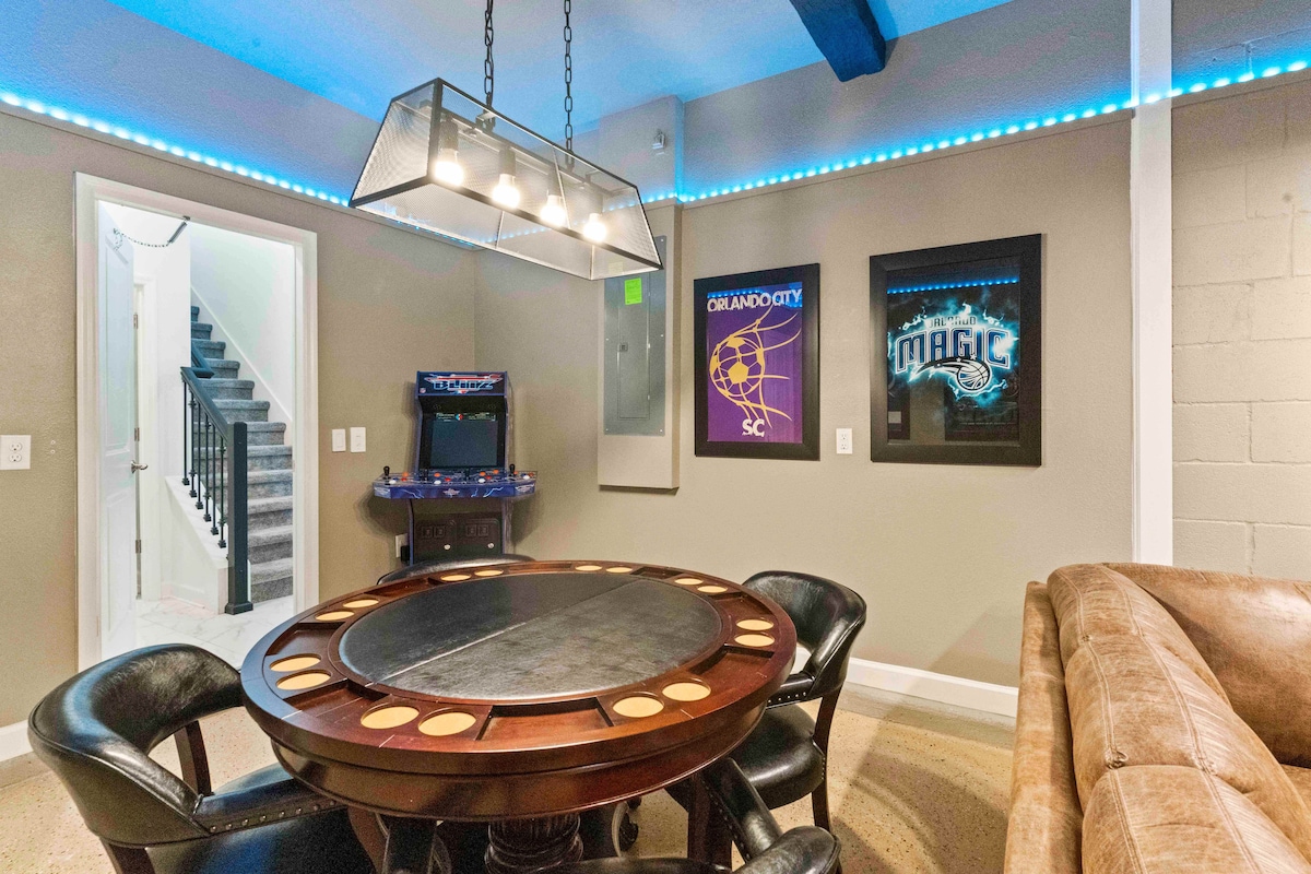 The game room is a highlight of this property, offering endless entertainment for guests of all ages. Whether you're playing a round of poker, competing in arcade games, or simply relaxing with the Smart TV, this space is designed for fun and enjoyment.