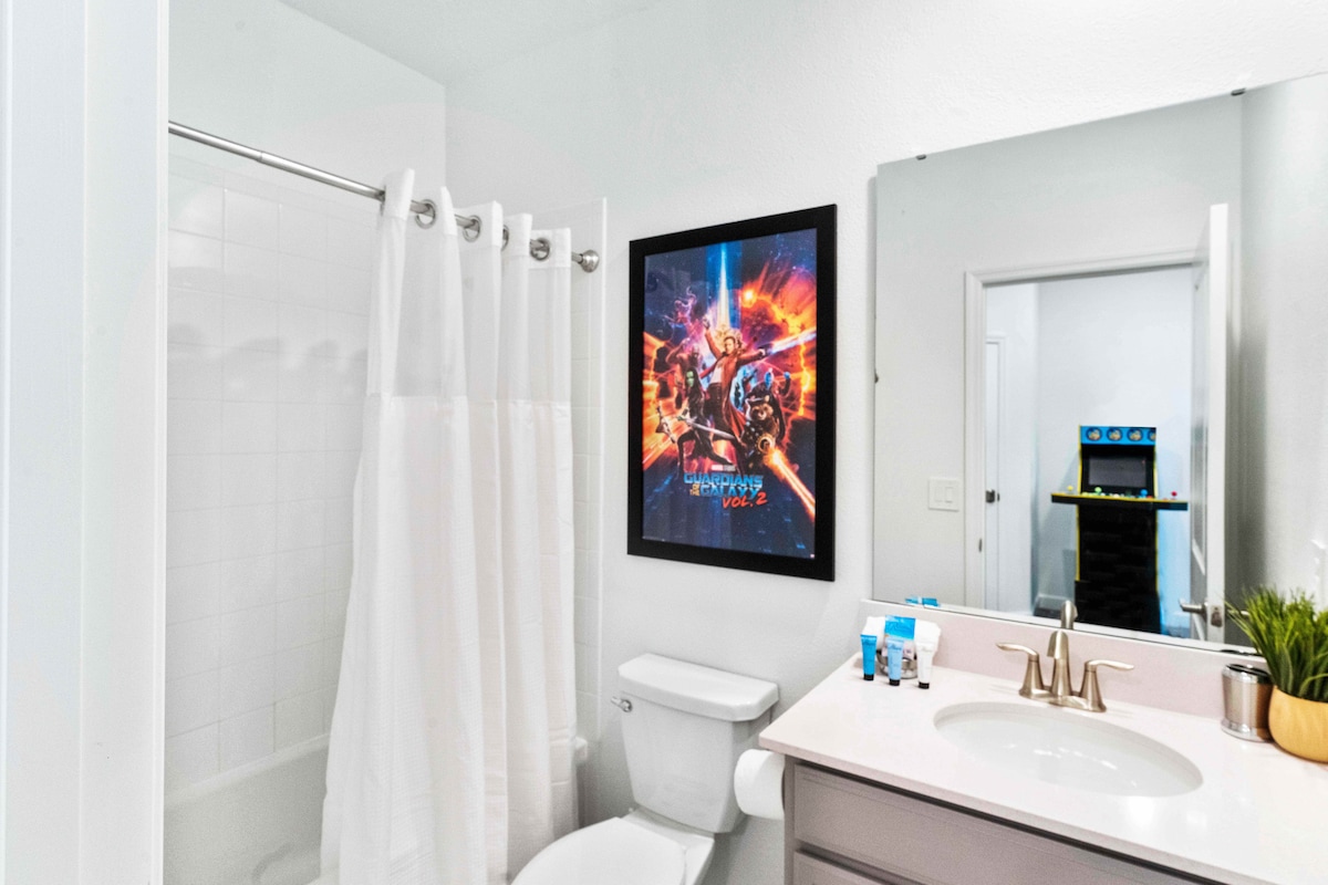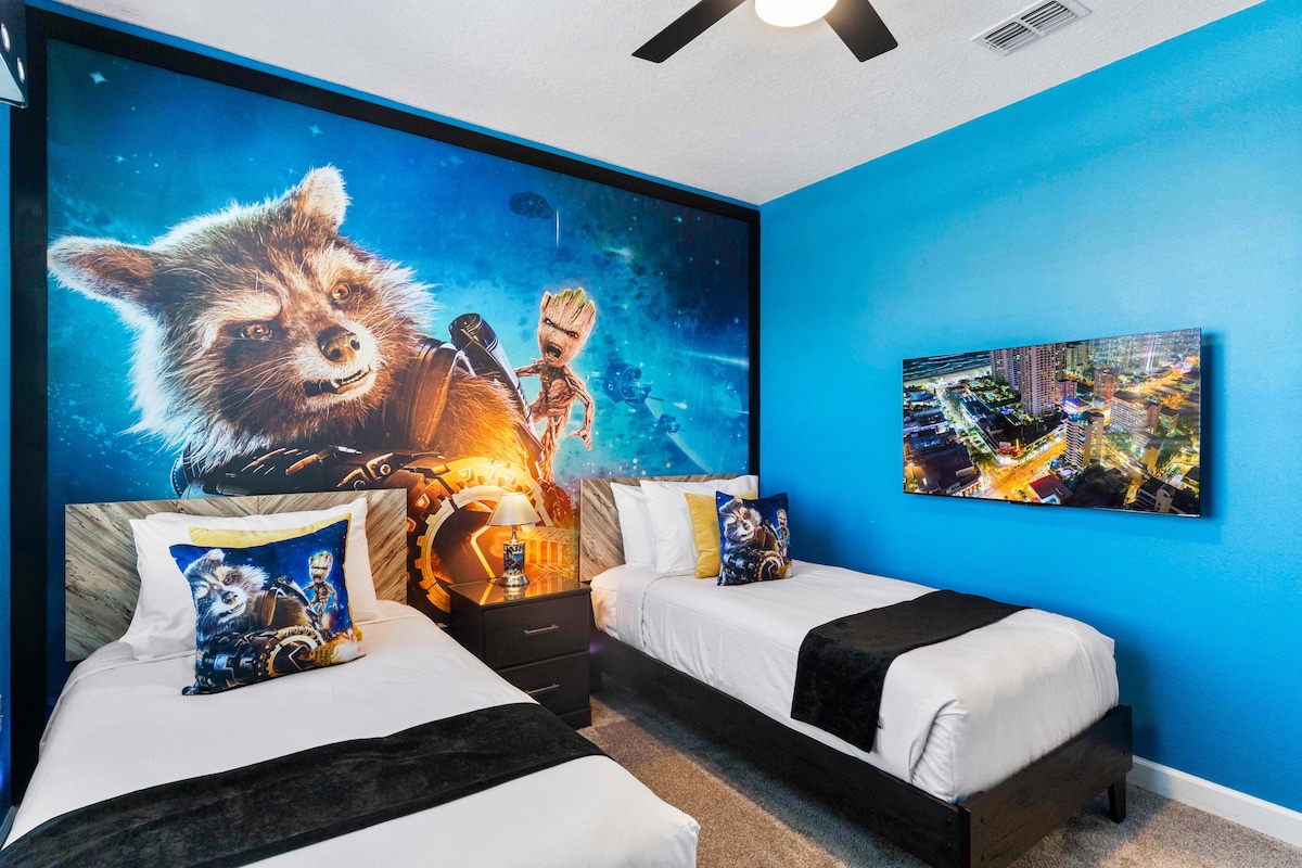 The fifth bedroom, featuring a Guardians of the Galaxy theme and two twin beds, is perfect for kids or those young at heart. With themed décor and fun touches, it’s a space that sparks imagination and adds to the excitement of your stay.
