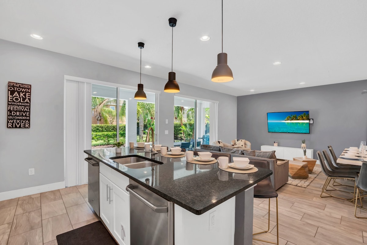 Relax in the open-concept living area with plush couches, a large flat-screen TV, and serene views of the dazzling private pool through sliding glass doors. With free high-speed Wi-Fi and comfortable seating, this is the perfect spot to unwind after a day of exploring Central Florida’s attractions.