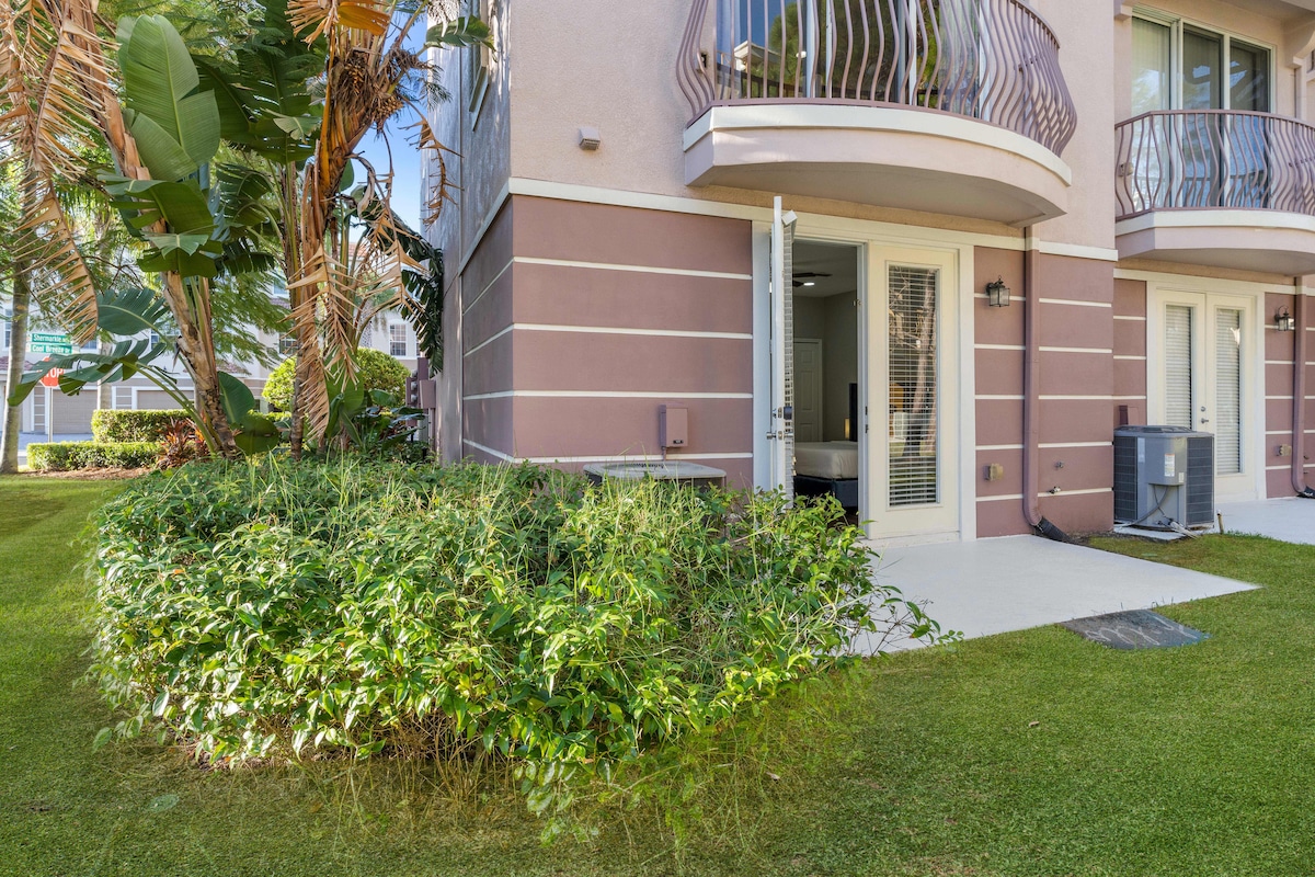 Step out onto your private balcony to soak in tranquil views of lush greenery and charming architecture, perfect for sipping your morning coffee or enjoying a peaceful sunset. Downstairs, the walk-out patio opens to a beautifully manicured lawn, offering a serene space for reading, relaxing, or casual outdoor dining. With both upstairs and ground-level outdoor access, you’ll experience the best of indoor-outdoor living during your stay.