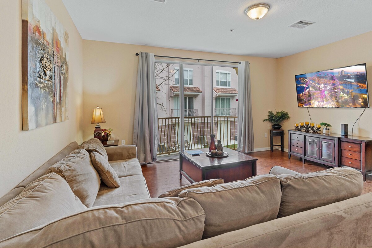Step into the spacious, open-concept living area designed for relaxation and entertainment. With plush sofas, tasteful decor, and a 65-inch flat-screen TV, this space is perfect for unwinding after a day of exploring Orlando’s attractions. Enjoy movie nights with your family or friends or simply relax with a book in hand.