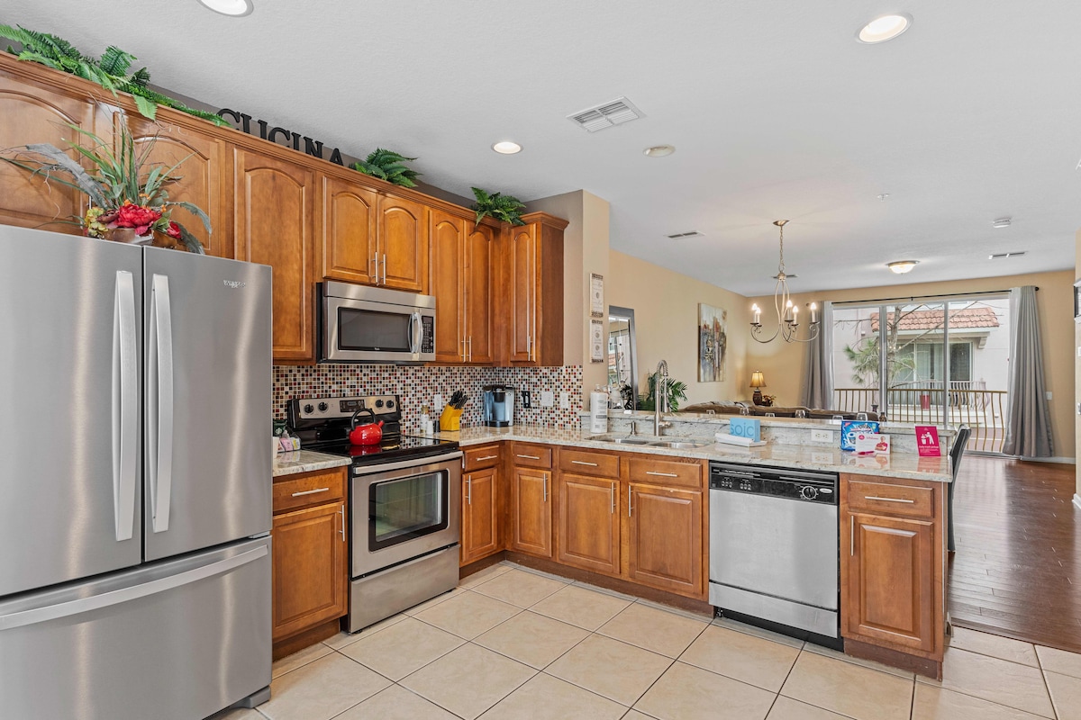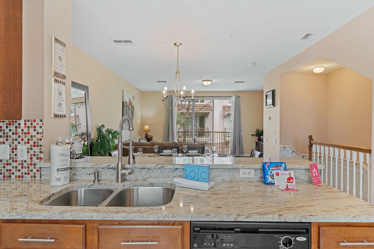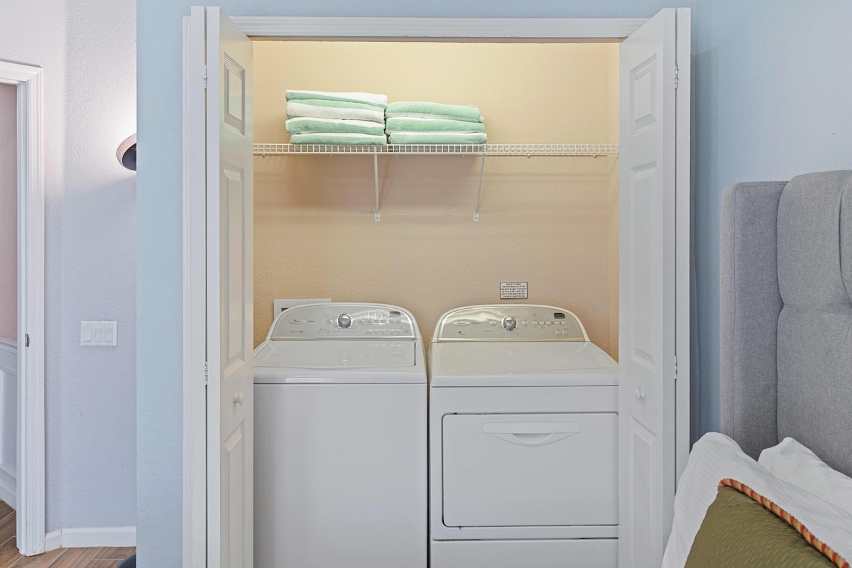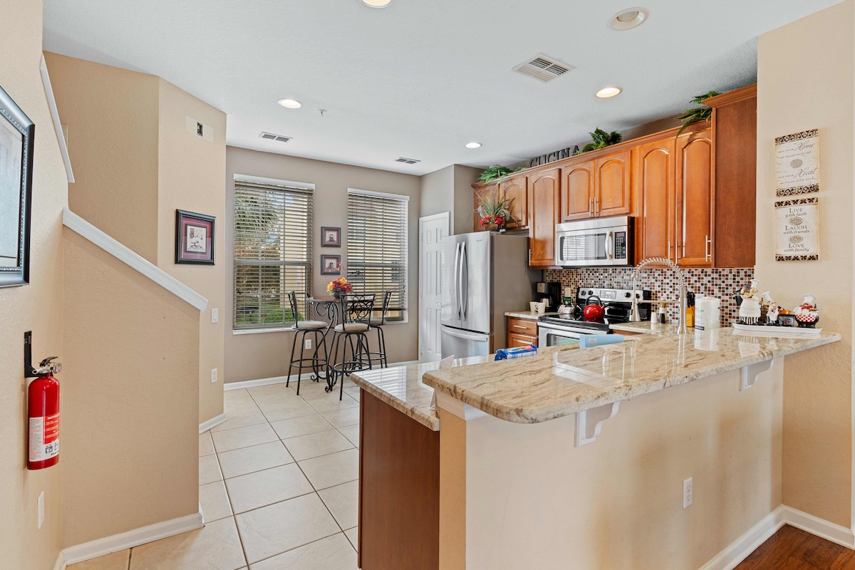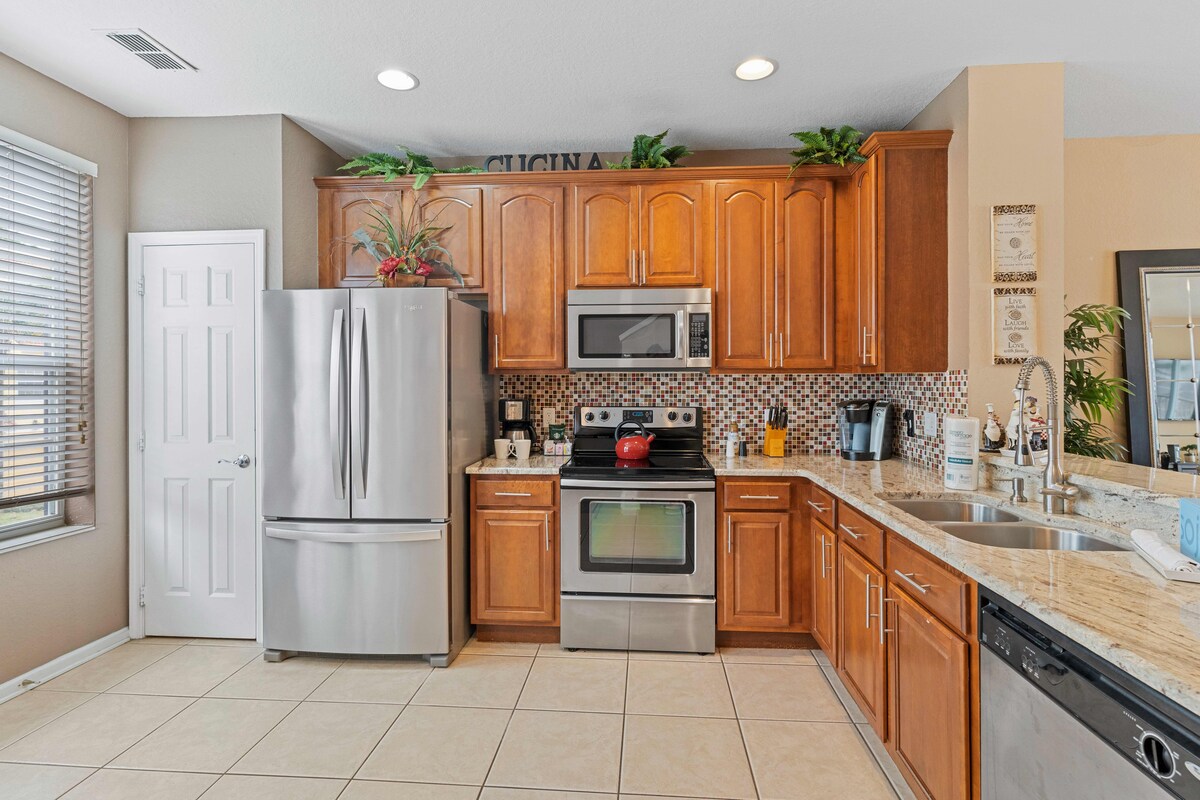 Our gourmet kitchen is equipped with modern appliances, granite countertops, and all the essentials to prepare meals during your stay. Whether you're whipping up breakfast before heading to the parks or creating a family feast, this kitchen has everything from pots and pans to a coffee maker, ensuring a hassle-free cooking experience.