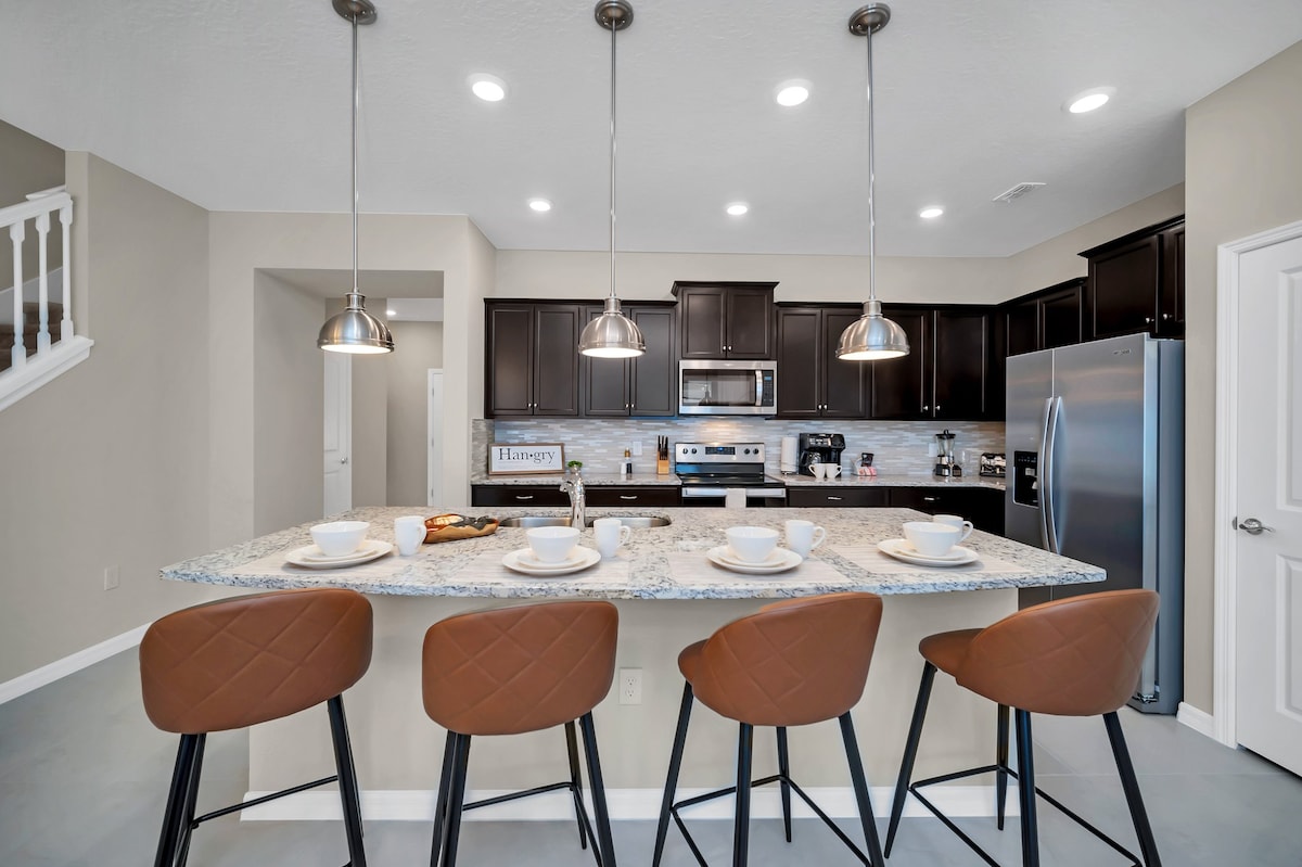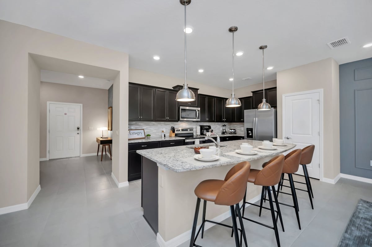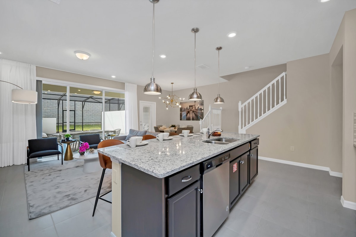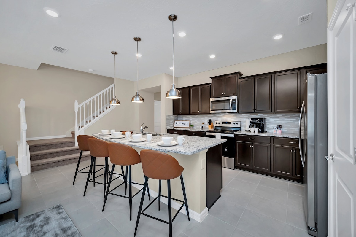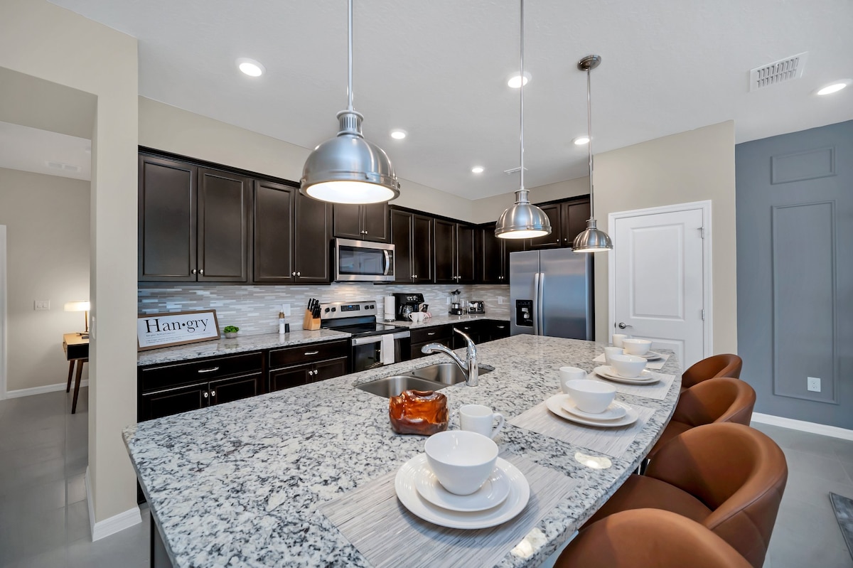 Prepare delicious meals with ease in a fully equipped kitchen featuring granite countertops, stainless steel appliances, and plenty of prep space. Pendant lighting and island seating create a warm ambiance, making this kitchen ideal for both casual breakfasts and special family dinners.