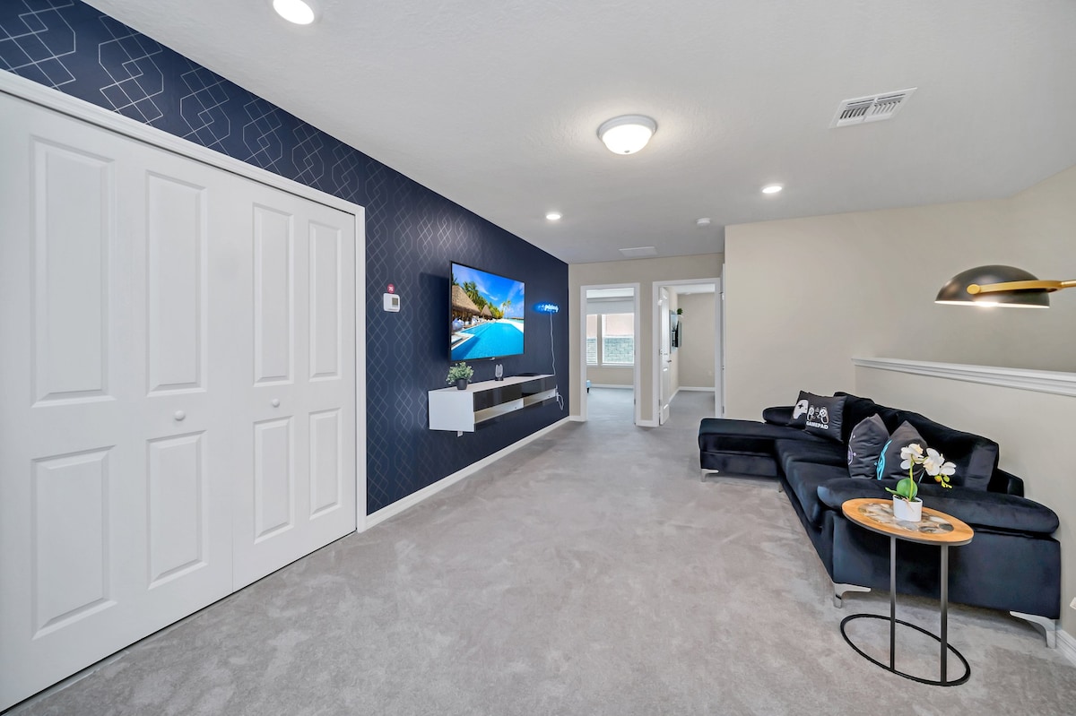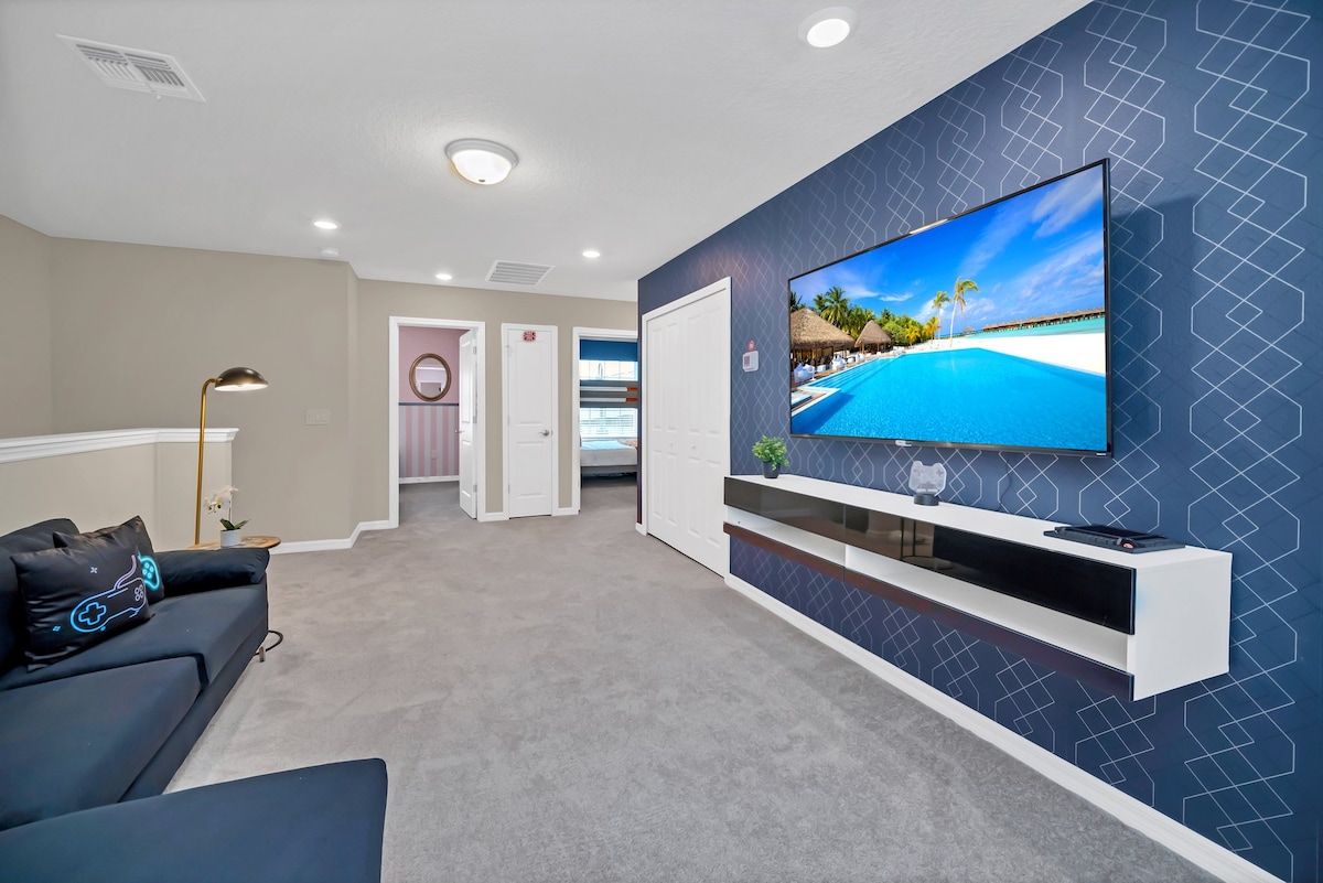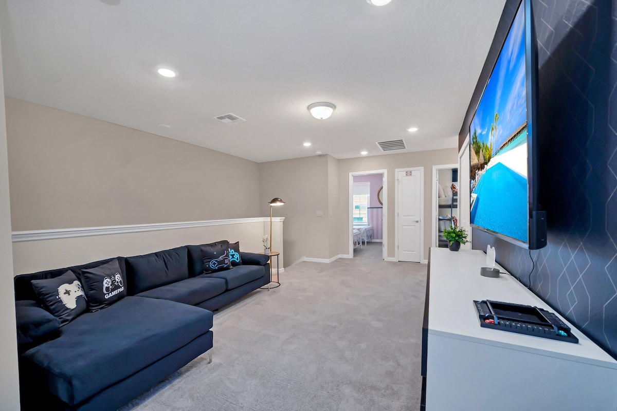 Upstairs, discover a separate family lounge with a large sectional and flat-screen TV, perfect for movie nights, games, or simply spending quality time together. Designed with families in mind, this cozy space enhances your vacation experience with extra room for everyone.