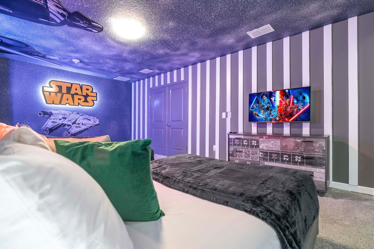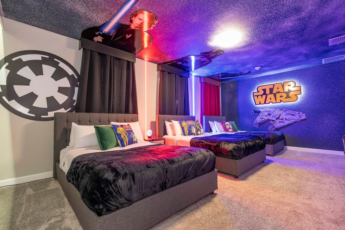 For Star Wars enthusiasts, the third bedroom is a dream come true with Darth Vader and Stormtrooper décor and three full beds. Let your imagination run wild in this galaxy-inspired retreat.