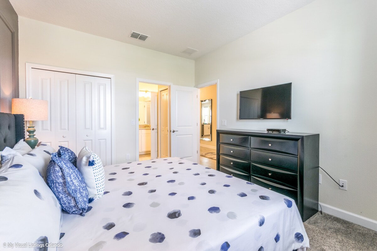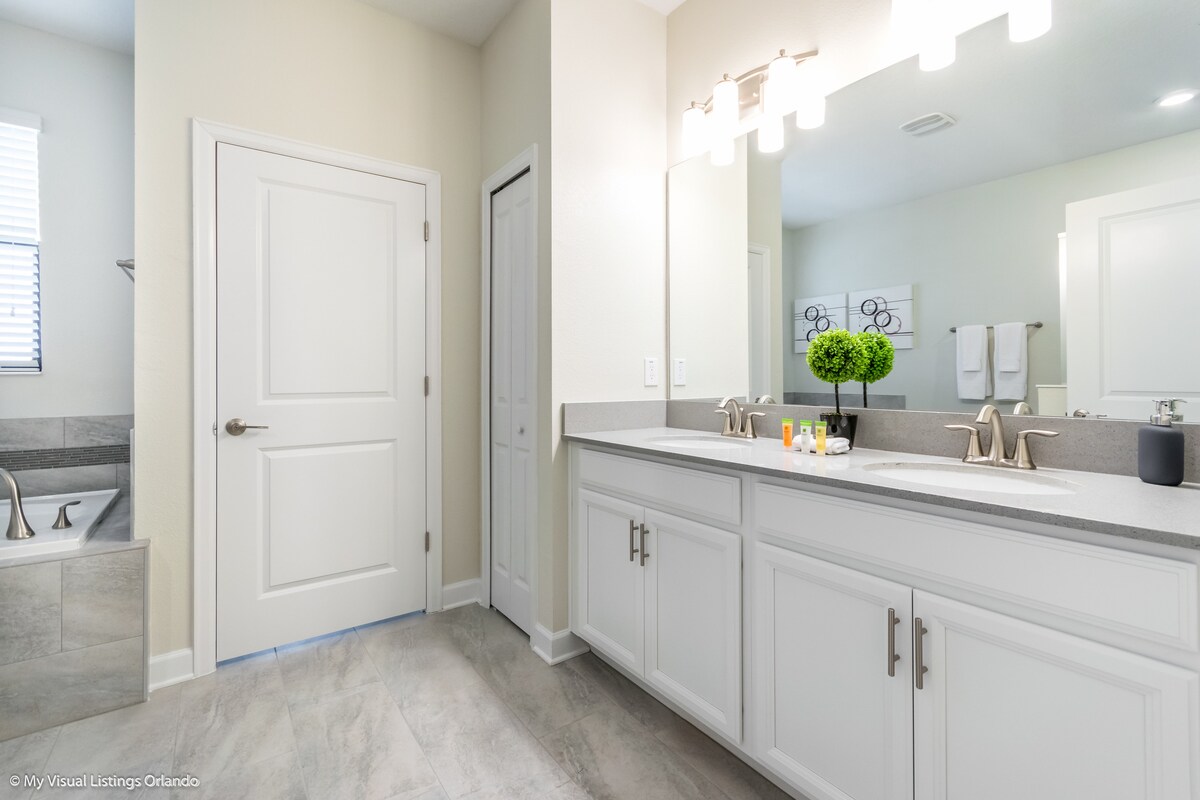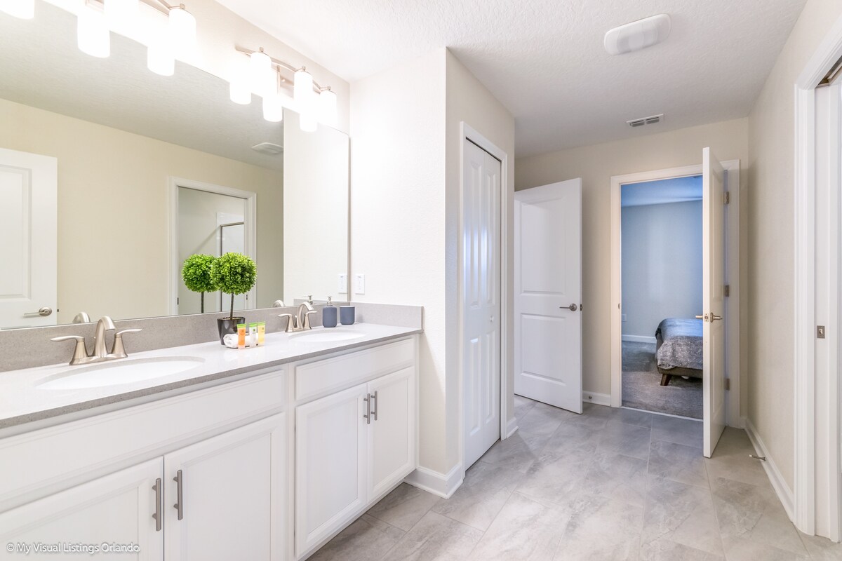 The fifth bedroom offers a cozy retreat with a full bed and twin bed, along with a Jack-and-Jill bathroom featuring double sinks for added convenience.