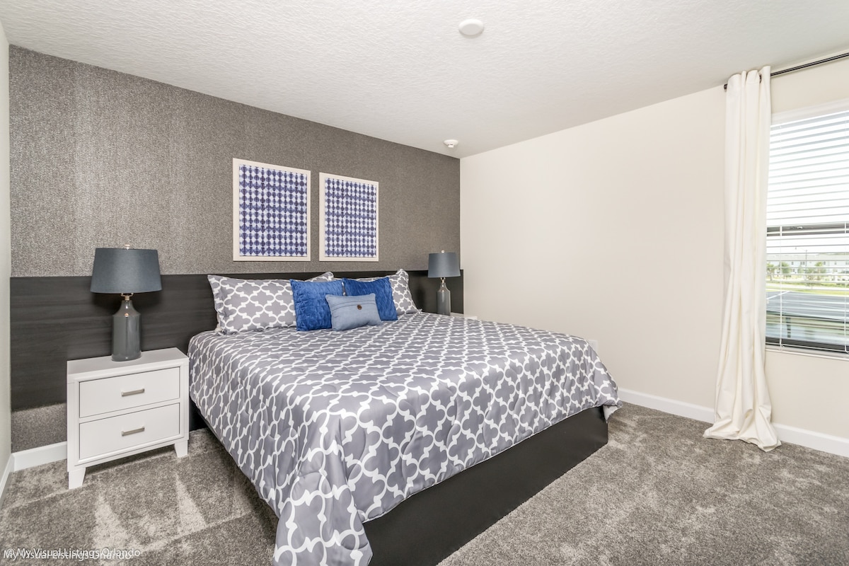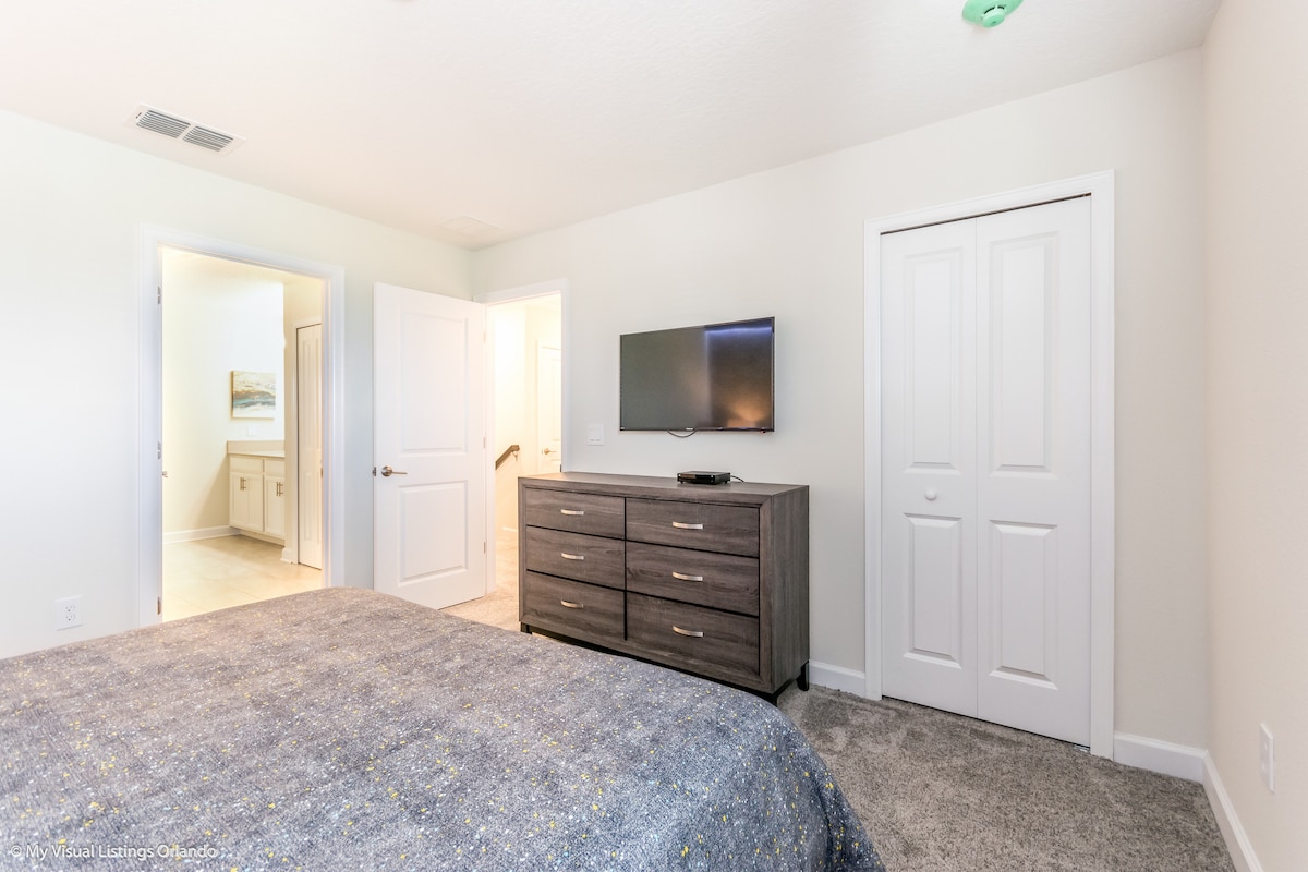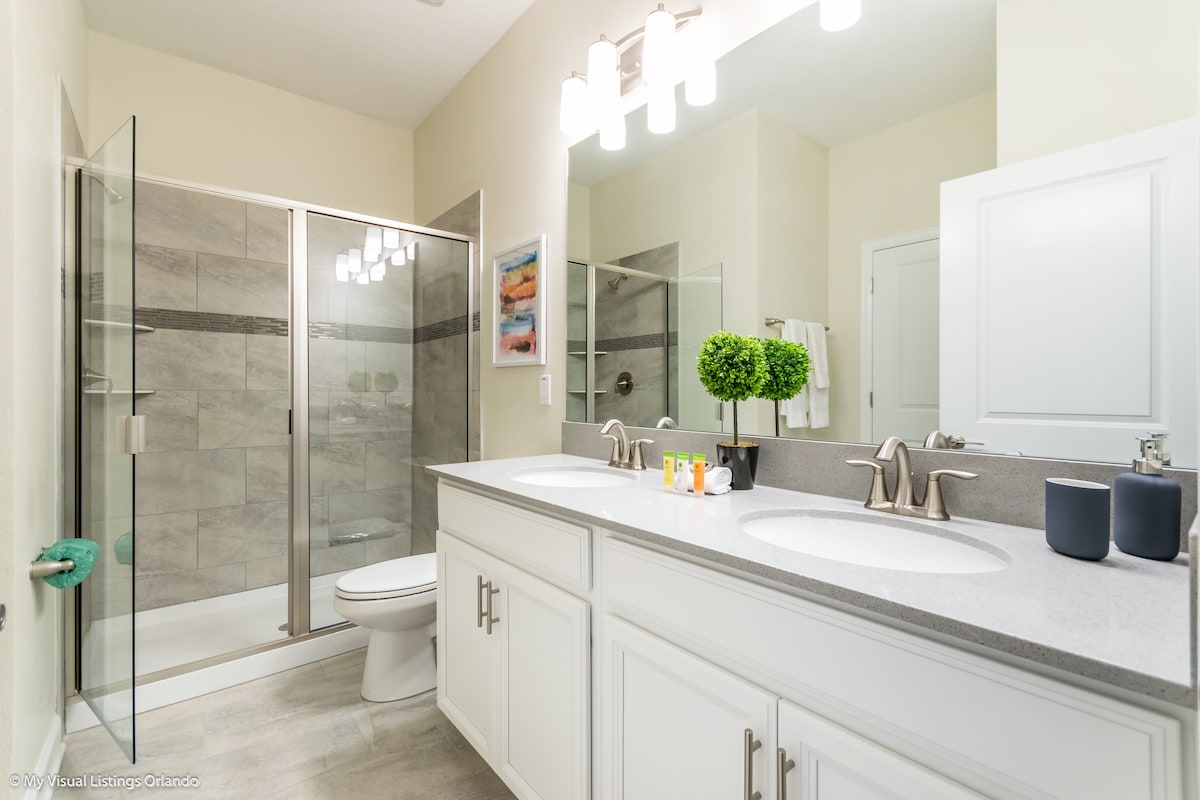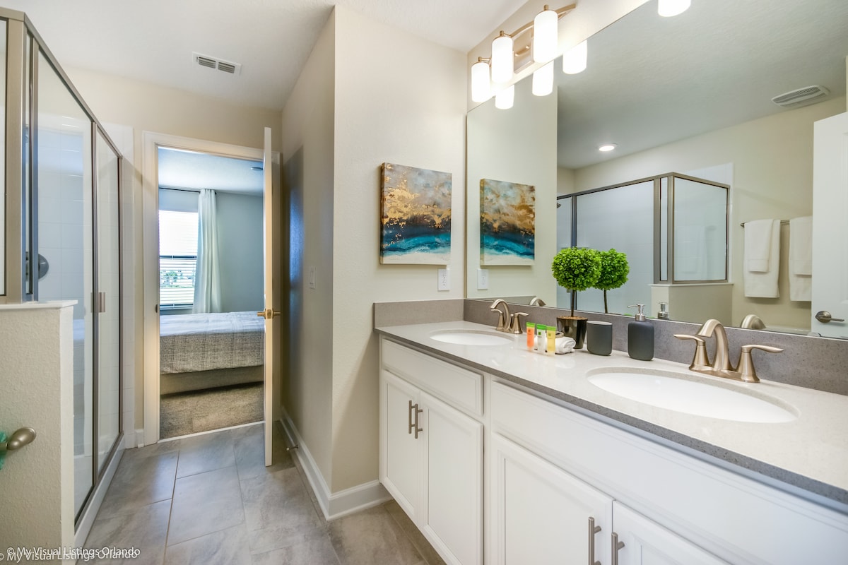 The fifth bedroom offers a cozy retreat with a full bed and twin bed, along with a Jack-and-Jill bathroom featuring double sinks for added convenience.
