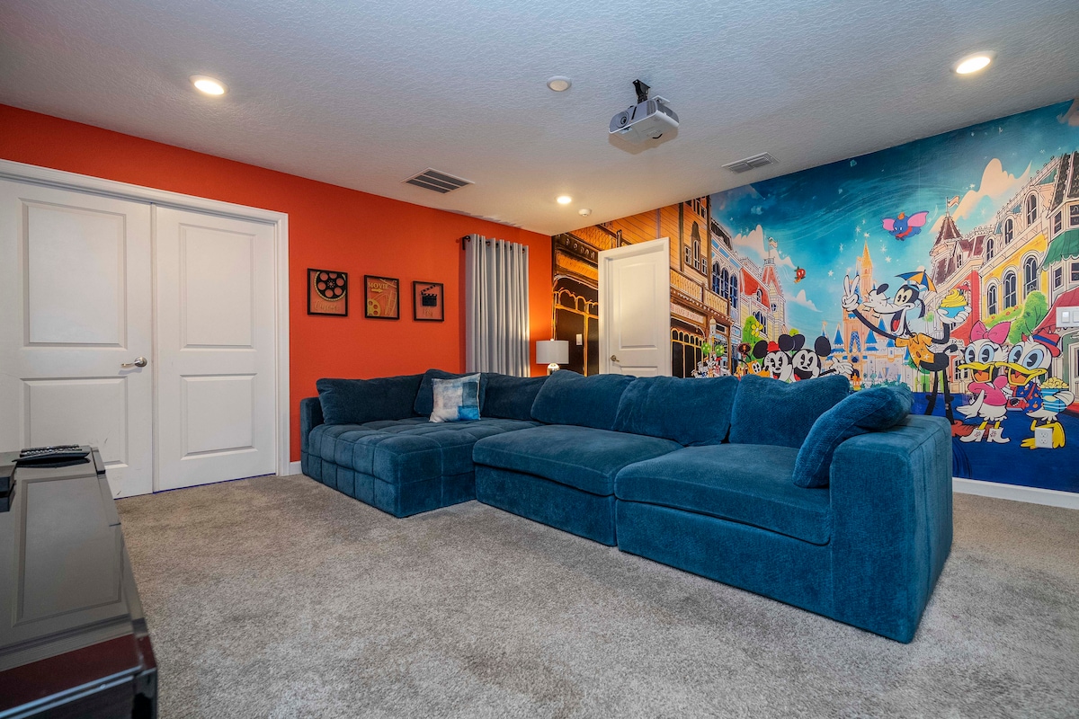 Head to the game room for hours of entertainment with two video game stations, a pool table, and a skeeball. Upstairs, enjoy movie nights with a huge projector TV and a large, plush couch for optimal viewing.