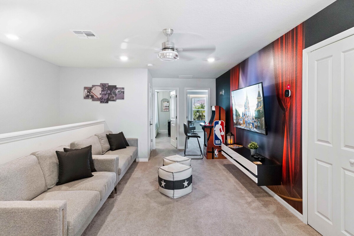 The entertainment loft offers an additional space for family fun. Equipped with an arcade game, game console, and smart TV, this area is perfect for movie nights, gaming sessions, or simply unwinding together. The nearby resort’s game room and mini golf add even more entertainment options.