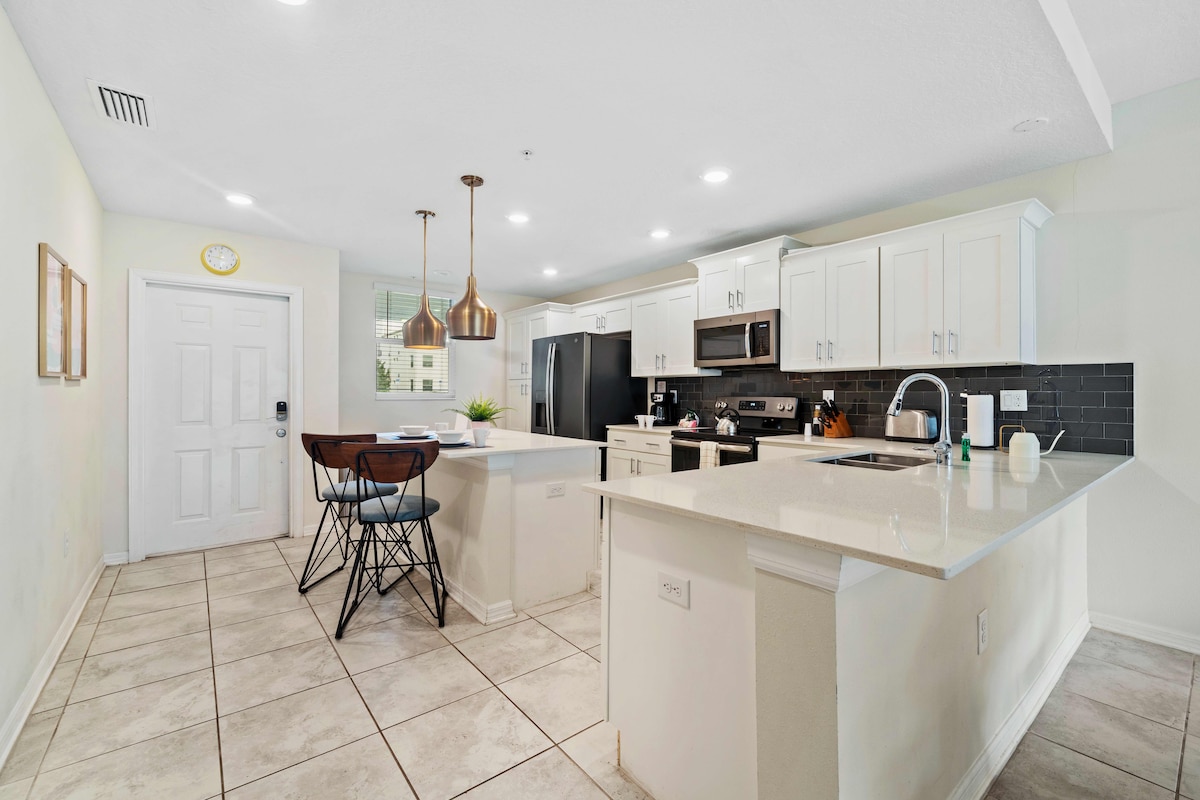 Whether you prefer cooking your own meals or ordering from nearby restaurants, the fully equipped kitchen has everything you need. Featuring stainless steel appliances, extra counter space, and a dining area, it’s the perfect spot to enjoy a family meal or a quick breakfast before heading out for the day.