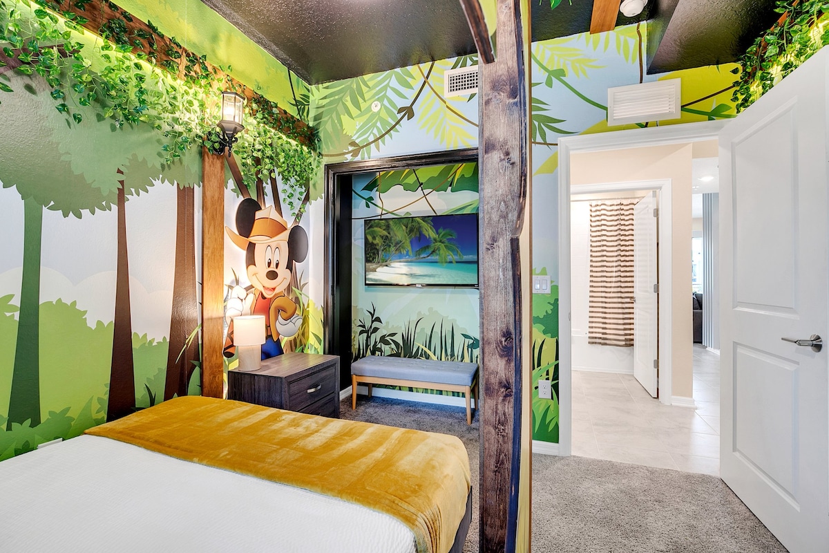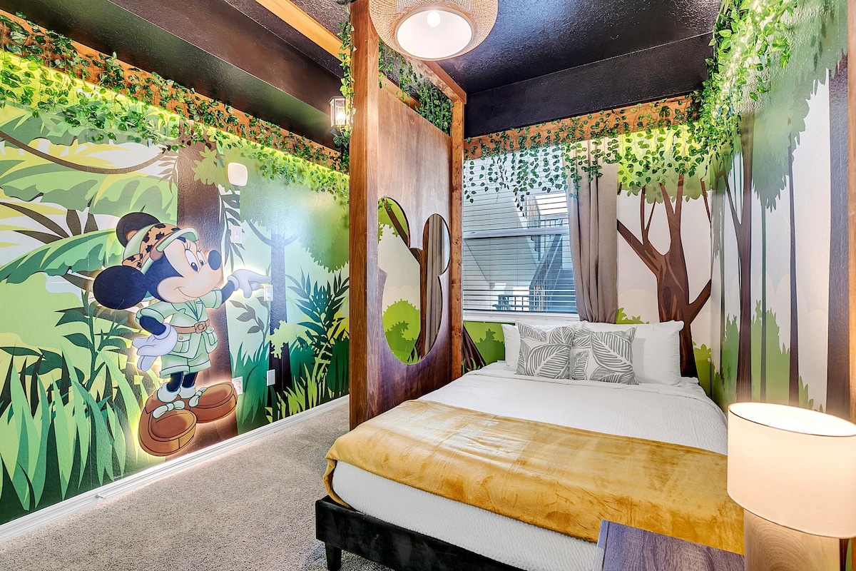 The master bedroom boasts a king-size bed, rustic touches, and an ensuite with a double vanity and walk-in shower. The second bedroom is a Mickey Mouse-themed oasis with a queen-size bed, making it ideal for the young at heart.