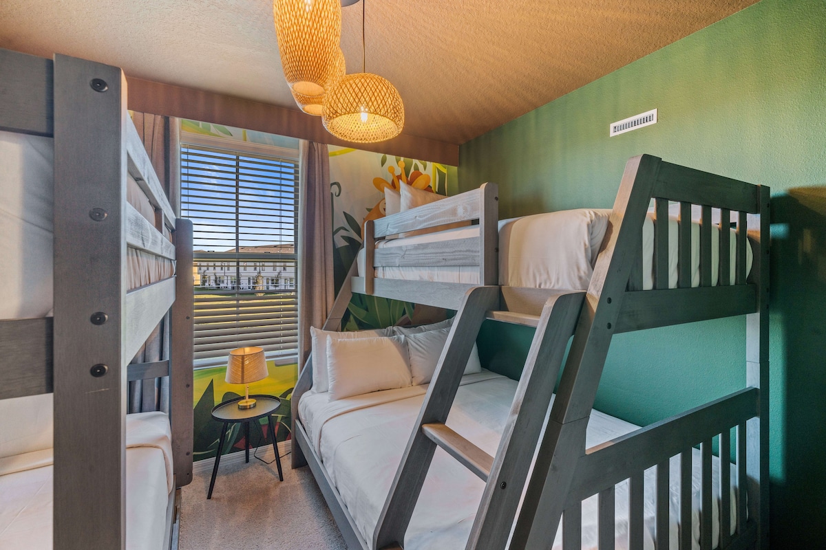 The main suite features a king-sized bed, a private bathroom, and Mickey-inspired décor, offering a restful escape. The second bedroom has a queen-sized bed and delightful Minnie-themed accents. For the kids or extra guests, the third bedroom is decorated with a fun safari Mickey theme and includes bunk beds and twin beds.