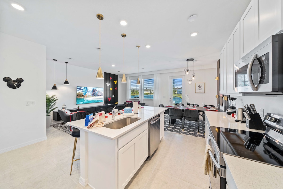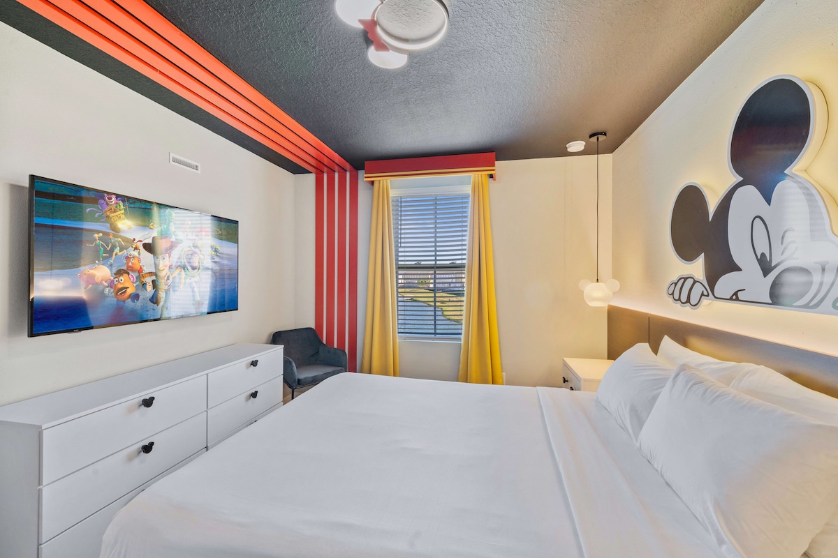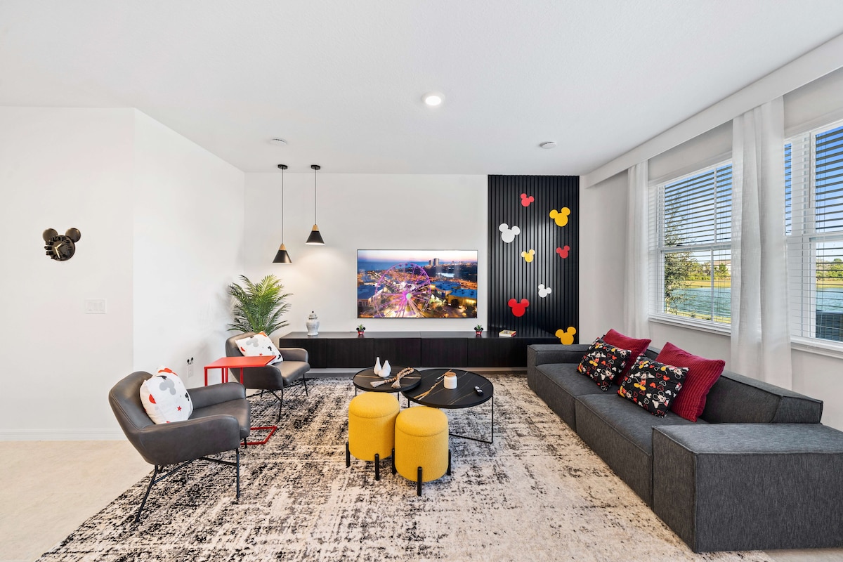 Step into a bright and airy living space featuring comfortable furnishings, a large flat screen TV, and thoughtful Mickey Mouse touches. This area is perfect for family movie nights or unwinding after a day at the parks, making everyone feel right at home.