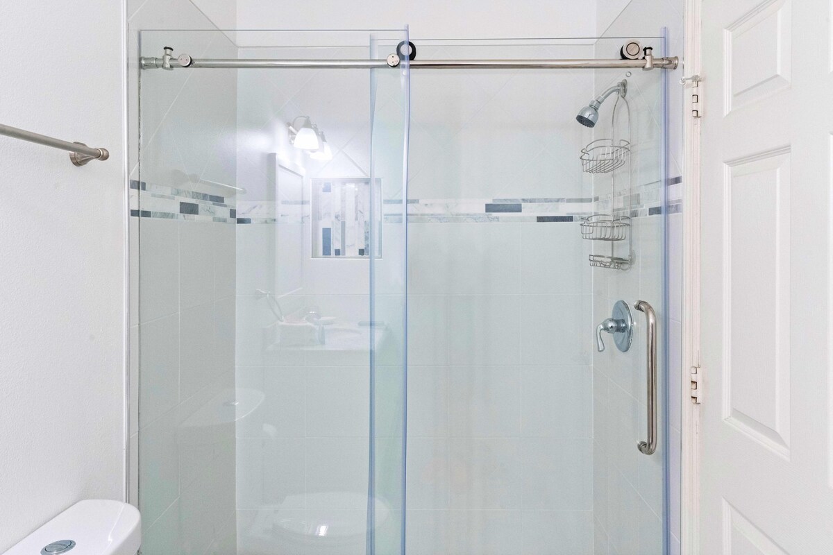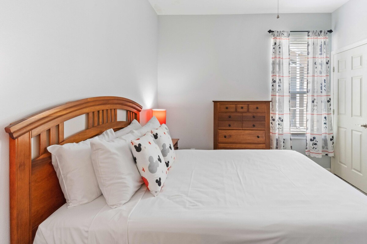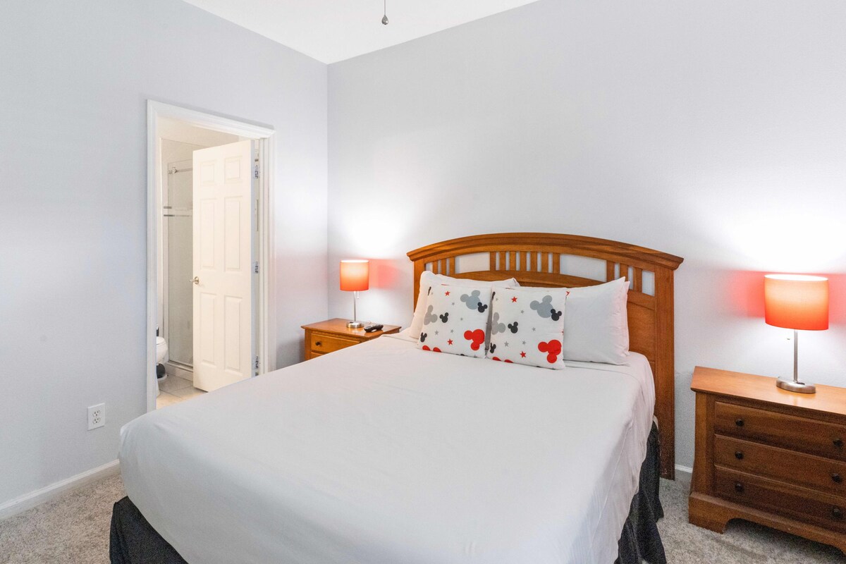 First Bedroom: Features a queen-size bed with Mickey Mouse-themed décor and a private bathroom with a shower. This room is perfect for those who love the classic Disney character.