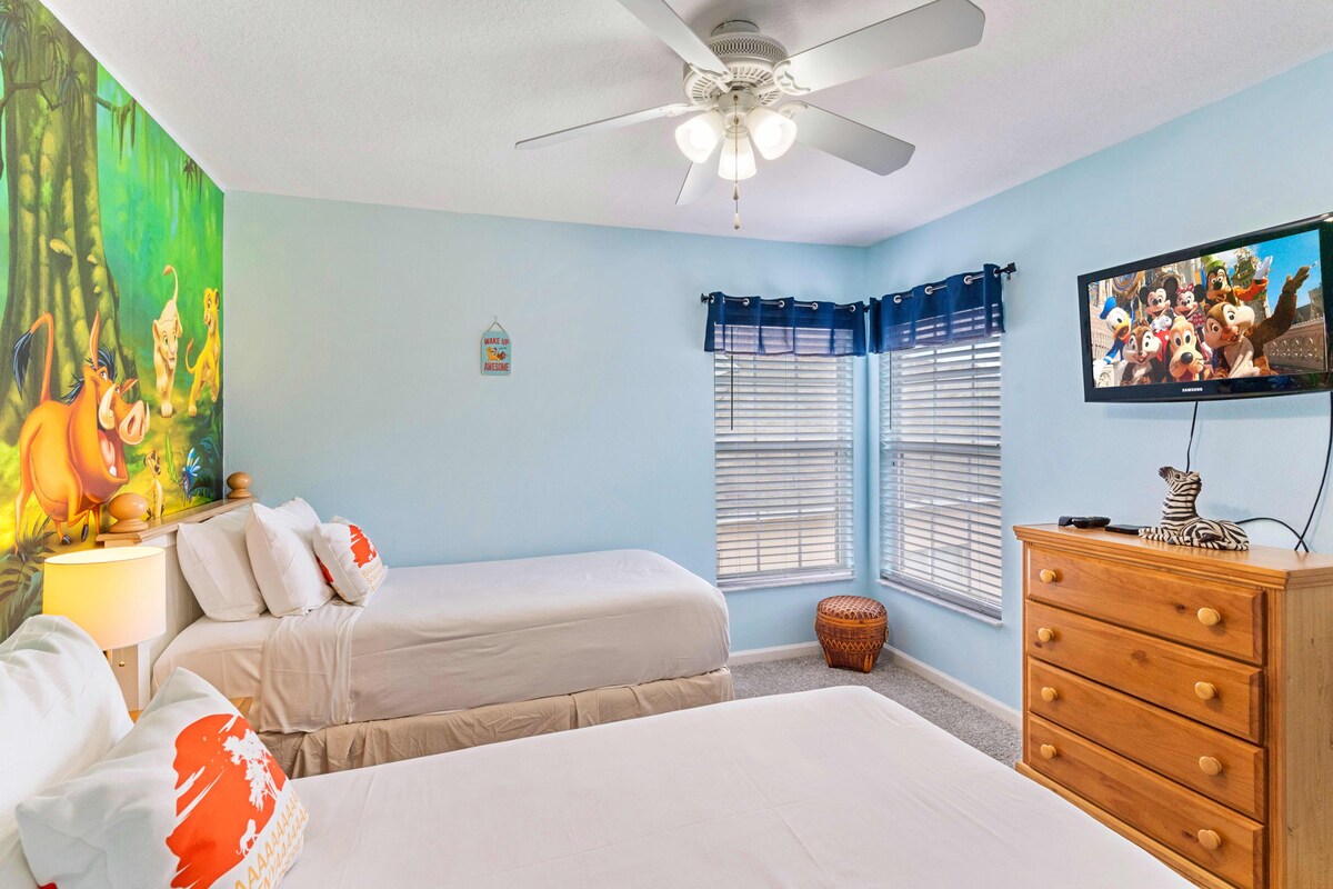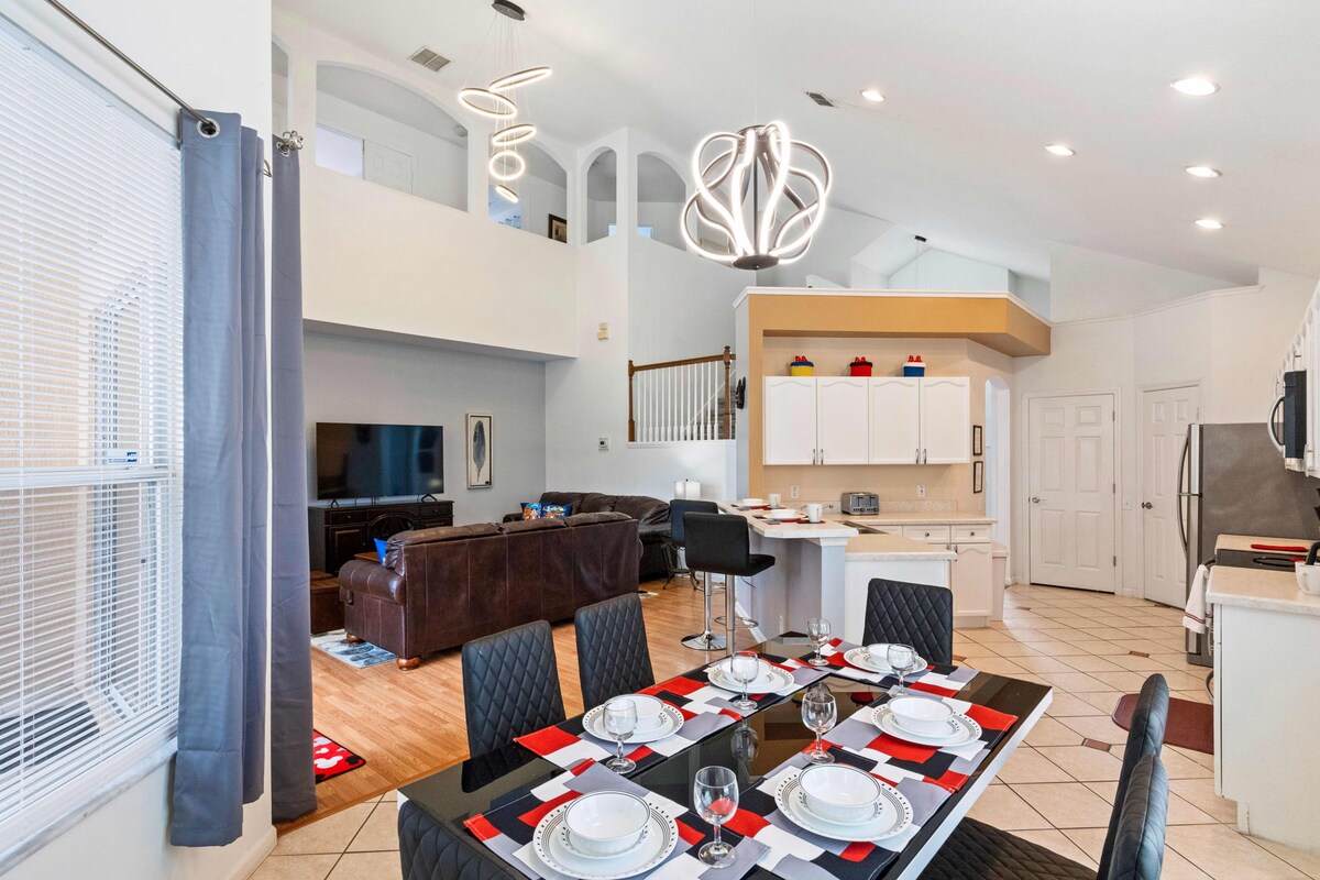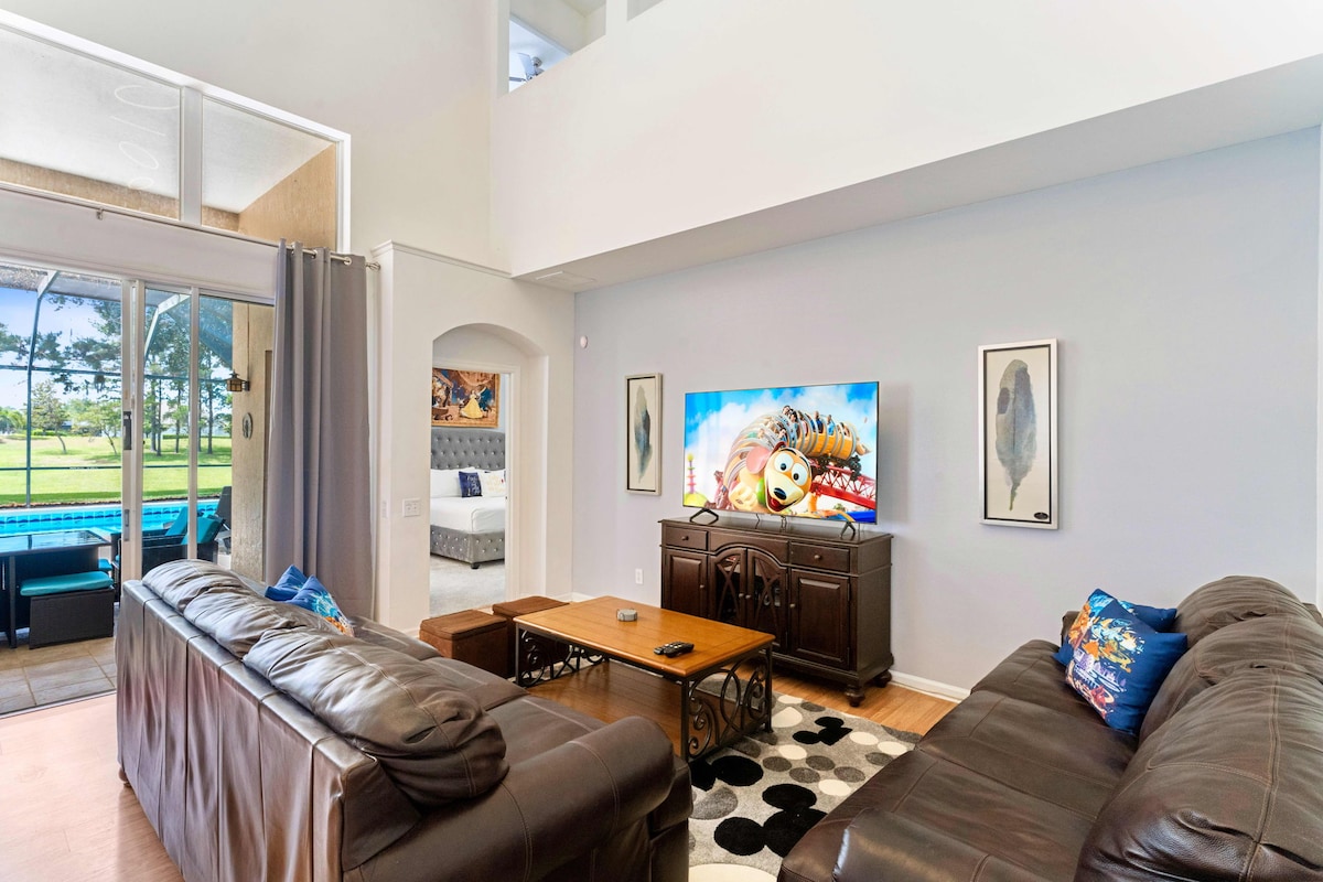 Step into a world of enchantment as you enter this beautifully decorated home, featuring Disney-themed décor throughout. Each room is designed to immerse you in the magic of Disney, from the spacious living room with its whimsical touches to the uniquely themed bedrooms that provide a delightful retreat for guests of all ages. The living room offers a cozy atmosphere for relaxation and entertainment, with comfortable seating and a large flat-screen TV.