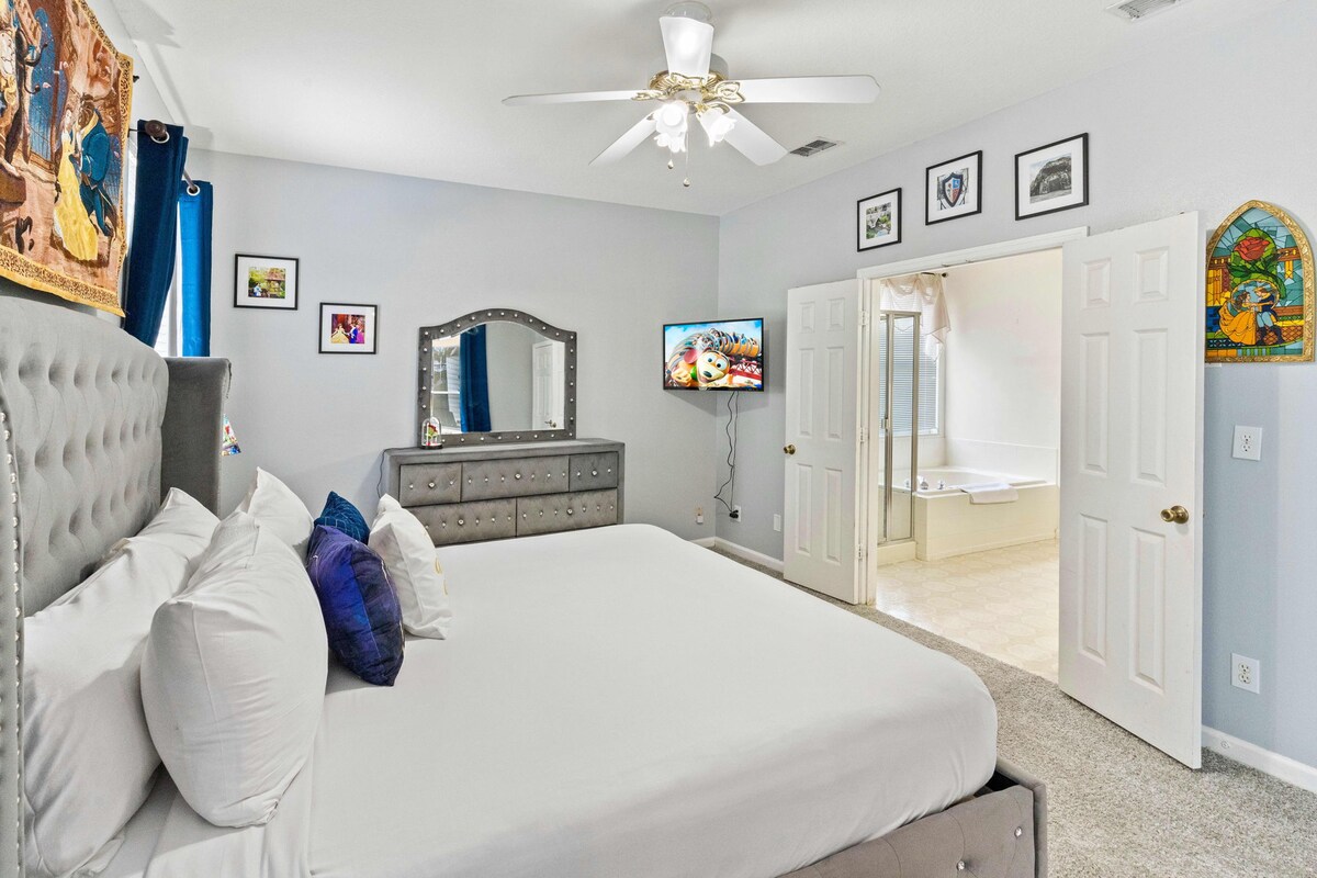 Main Bedroom: A tribute to the Disney movie "Beauty and the Beast," this room boasts a king-size bed and a spacious private bathroom with a combination shower and bathtub. The elegant décor and luxurious amenities make this room a true retreat.