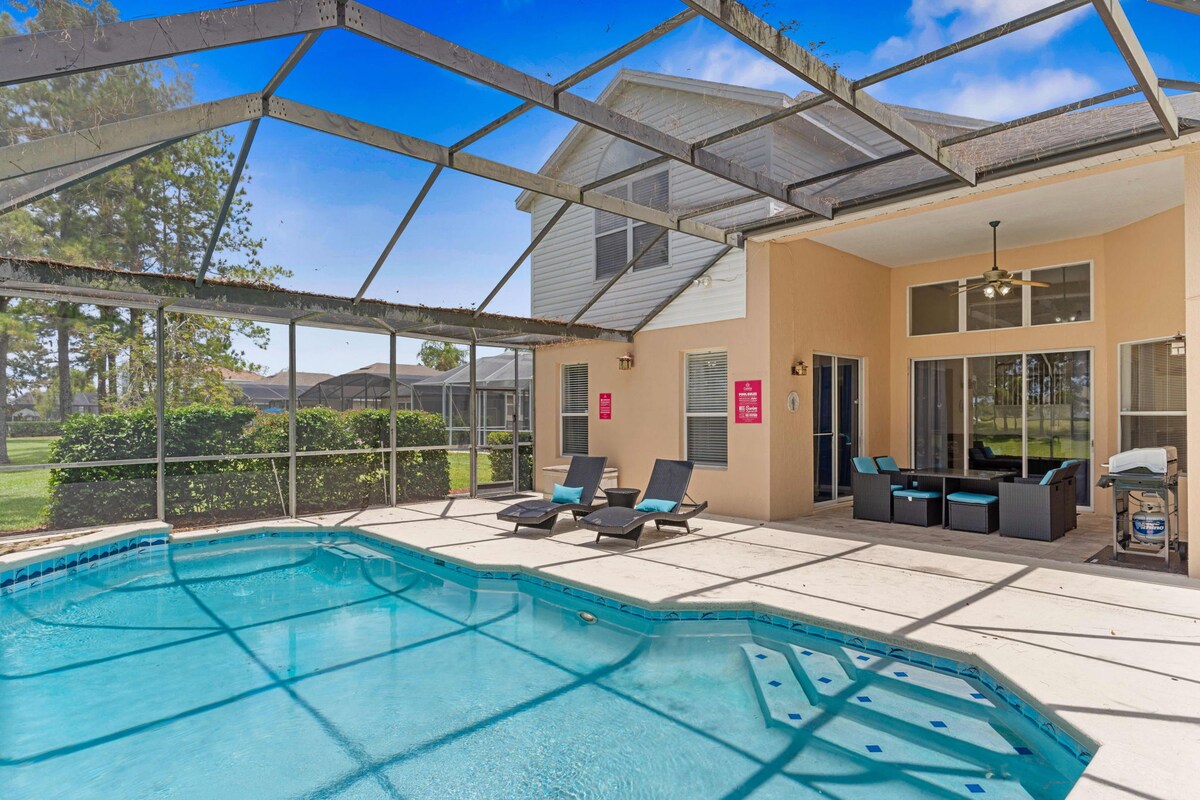 The outdoor space at this vacation home is truly an oasis. Step outside to find a beautiful pool area, complete with a sparkling private pool and stone cascade. Lounge chairs surround the pool, offering the perfect spot to soak up the Florida sun or relax with a good book. The BBQ grill and outdoor dining area make it easy to enjoy al fresco meals, while the green backyard provides a serene setting for outdoor activities and games. Whether you're swimming, dining, or simply unwinding, the outdoor space is designed for maximum enjoyment.