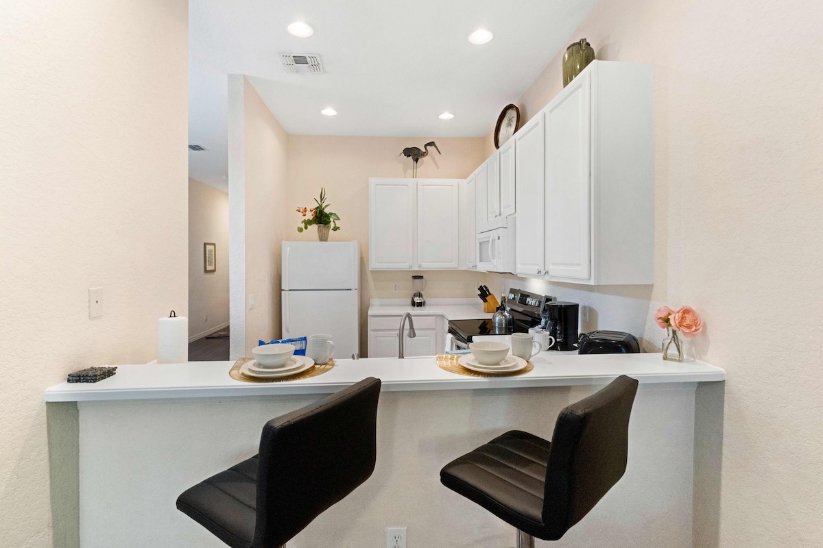 Step into the spacious living area, where plush seating and a Smart TV create the perfect space to unwind after a day of exploring Orlando’s theme parks. Whether you're catching up on your favorite shows or enjoying quality time together, this open-concept living space makes relaxation effortless.