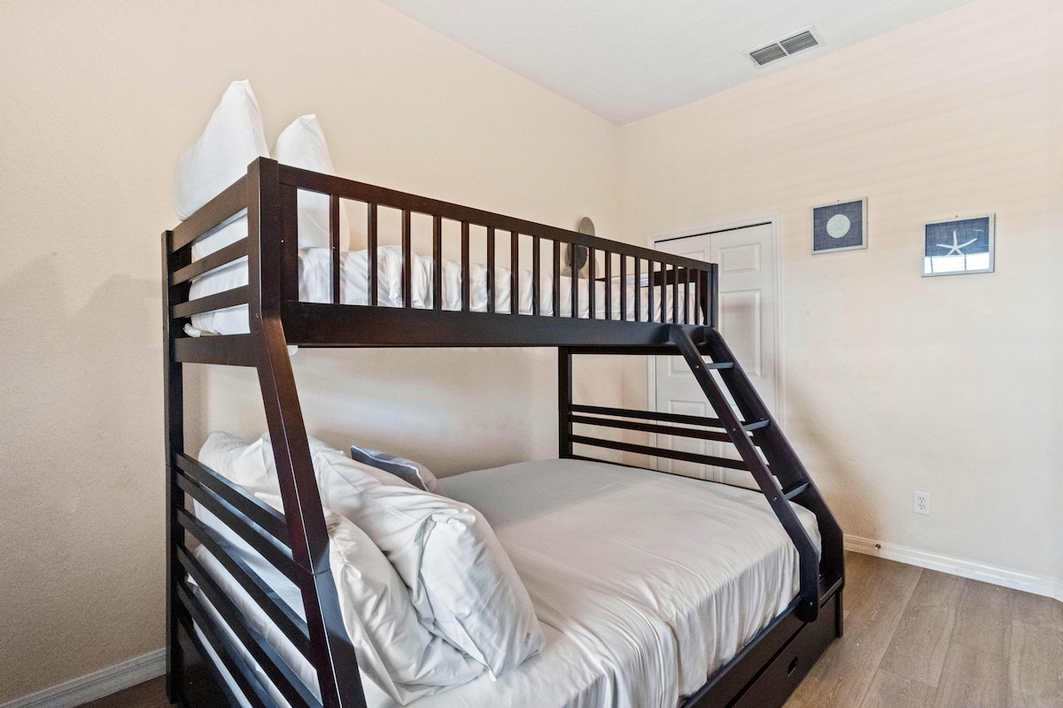 After a day of adventure, retreat to one of the cozy, themed bedrooms. The main bedroom features a queen-size bed, private balcony, and en-suite bathroom with a bathtub/shower combination. The second bedroom also boasts a queen-size bed, while the third bedroom, designed for kids, offers a fun bunk bed setup. Each room includes a Smart TV for personalized entertainment.