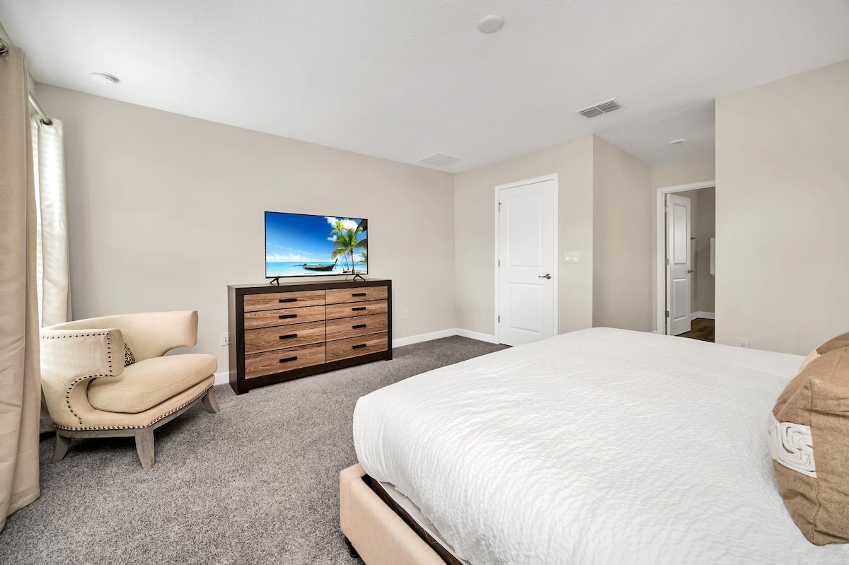 The additional den offers ample space with a cozy sectional, sleek furnishings, and another wall-mounted Smart TV for binging your favorite shows. It also includes a dedicated workspace, making it easy to catch up on work or check in with loved ones while relaxing in style.