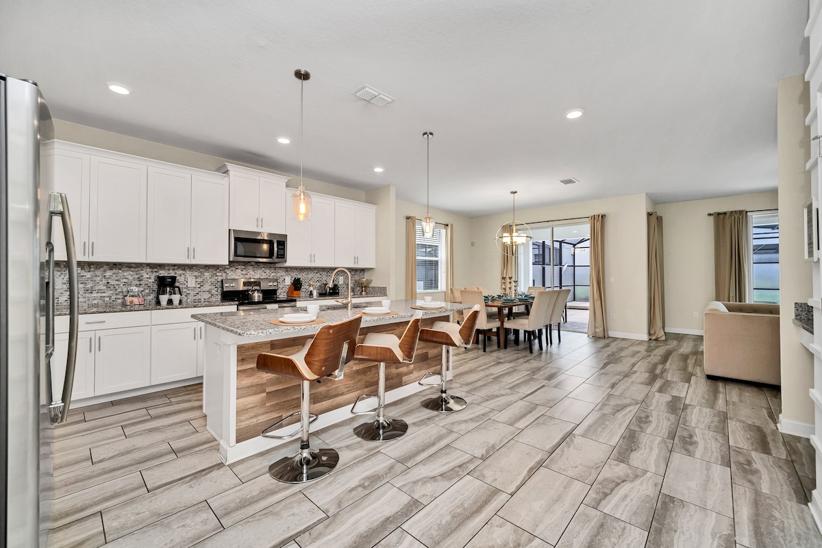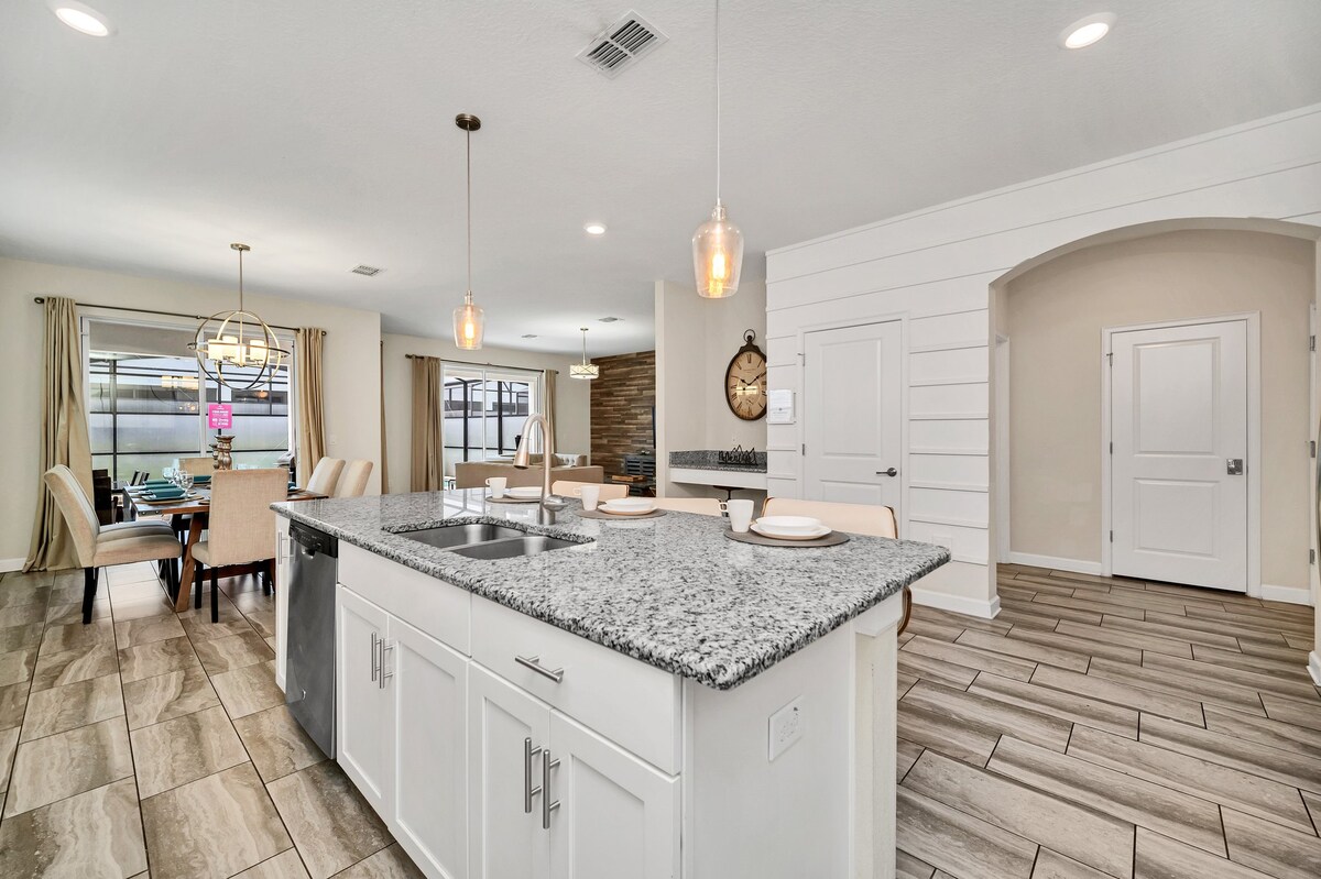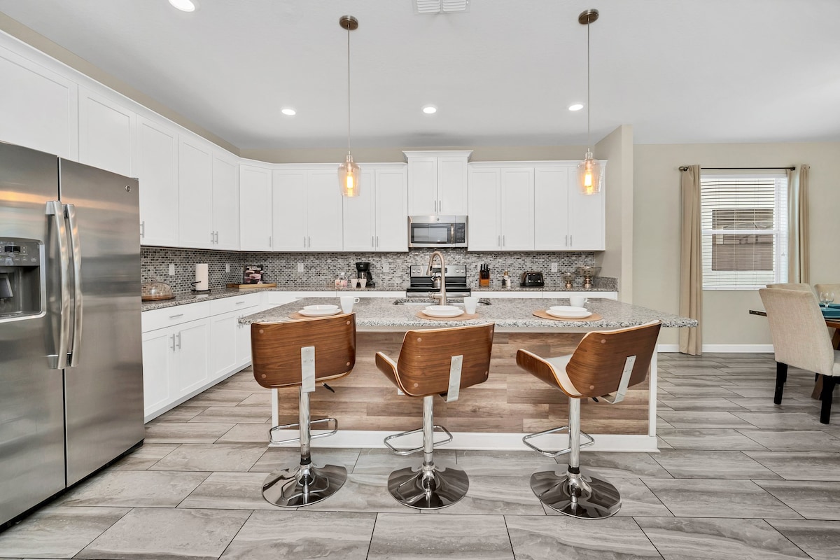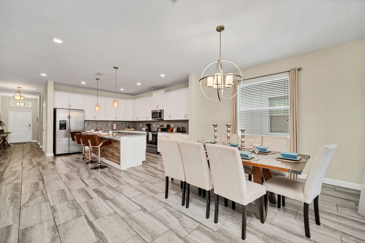 The kitchen has thick granite countertops, a stunning backsplash, and stainless-steel appliances. Whether preparing a family meal or grabbing a snack, the full kitchen provides everything you need. Enjoy your meal at the kitchen island or head to the dining area, where a stately table for eight awaits. The space boasts an excellent view of the outdoor lanai and patio, perfect for gatherings.