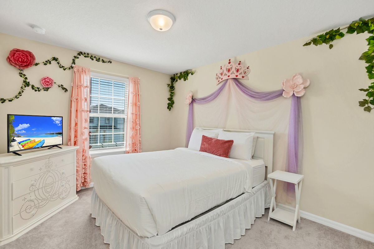 On the main floor, a queen bedroom provides easy access for those who prefer to stay close to common areas. Upstairs, three uniquely themed bedrooms add a touch of magic to the stay: