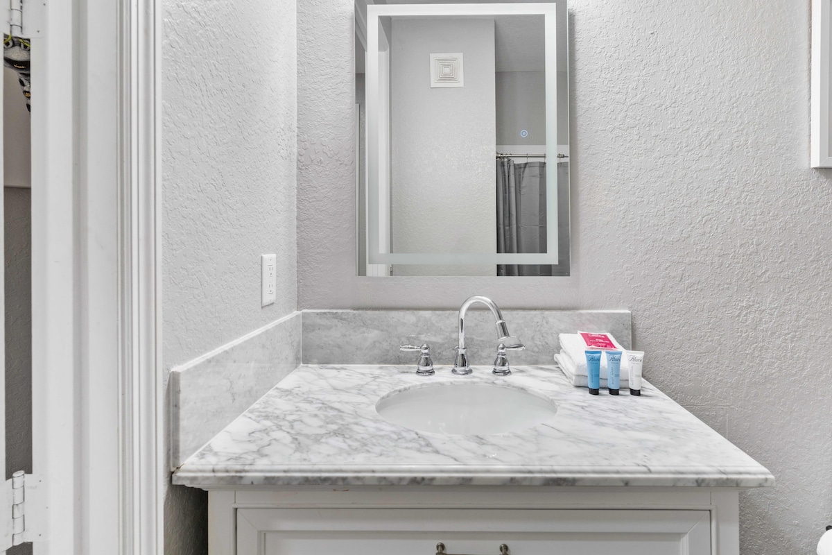 Unwind in the beautifully renovated bathrooms, complete with LED lighted mirrors and luxurious faucets. Whether you’re getting ready for a day at the parks or relaxing in the evening, these bathrooms offer a touch of elegance to your stay.