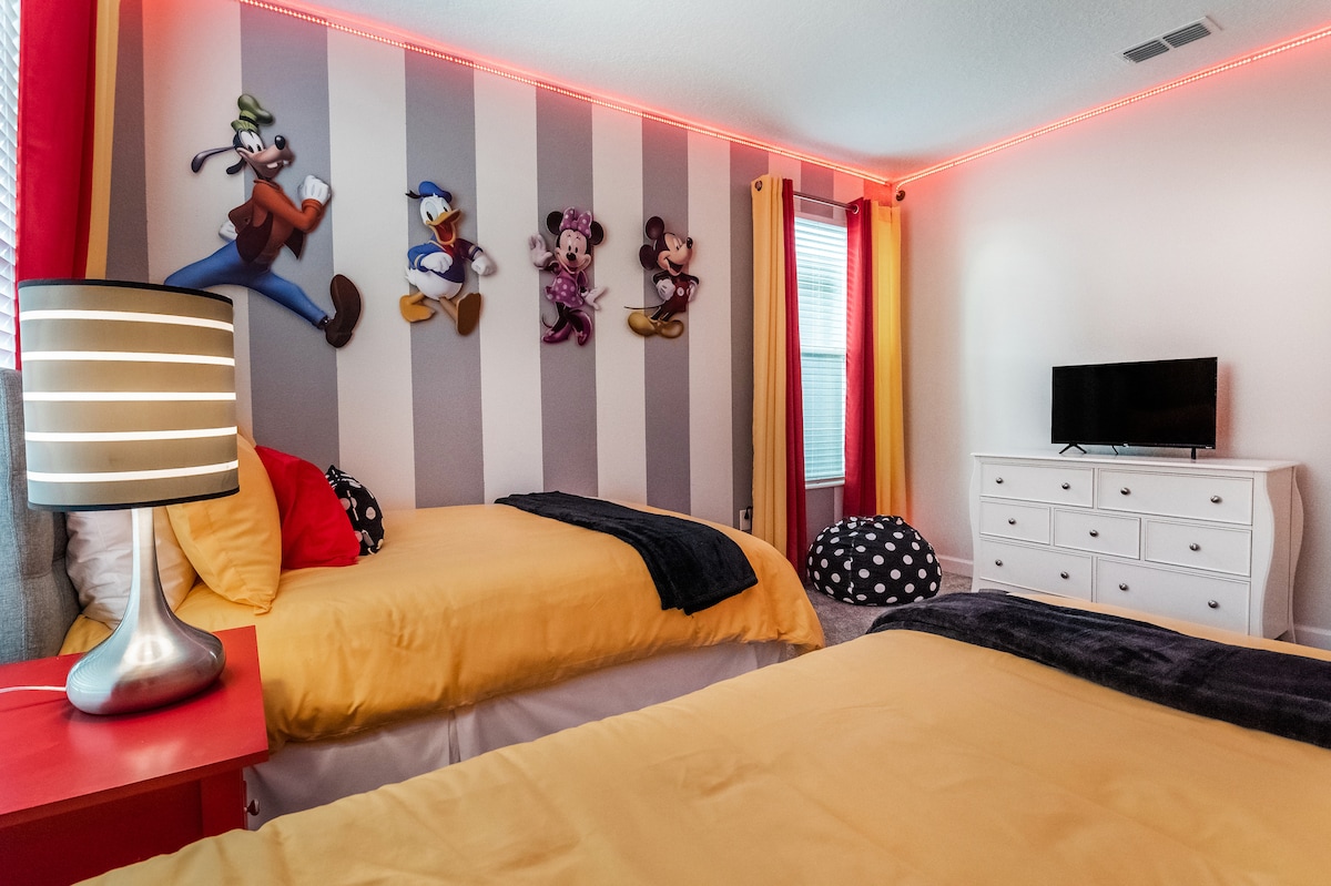 For fans of the fab five, the themed room featuring two twin beds adorned with Mickey, Minnie, Donald, Goofy, and Pluto décor is a festive delight. Glow with illuminations in this cheerful space inspired by happily-ever-afters.