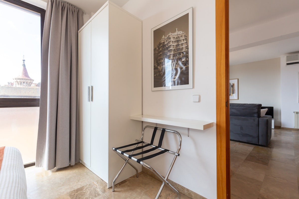 You wake up to the sun rising over Barcelona's most famous buildings, gently streaming in through the window of your fifth-floor bedroom. You pad across the marble floors in your slippers and brew a cup of coffee, then head to the rooftop terrace. Look left and see the spires of Sagrada Familia rising above the rooftops. Look right, and over the top of the Conservatory of Music you can make out a glimmer of the sparkling Mediterranean, calling you to make every day a beach day.From up here, life in Barcelona is good.