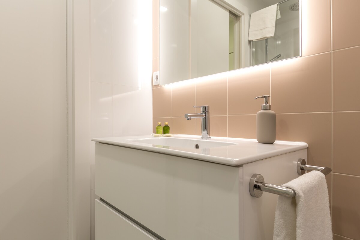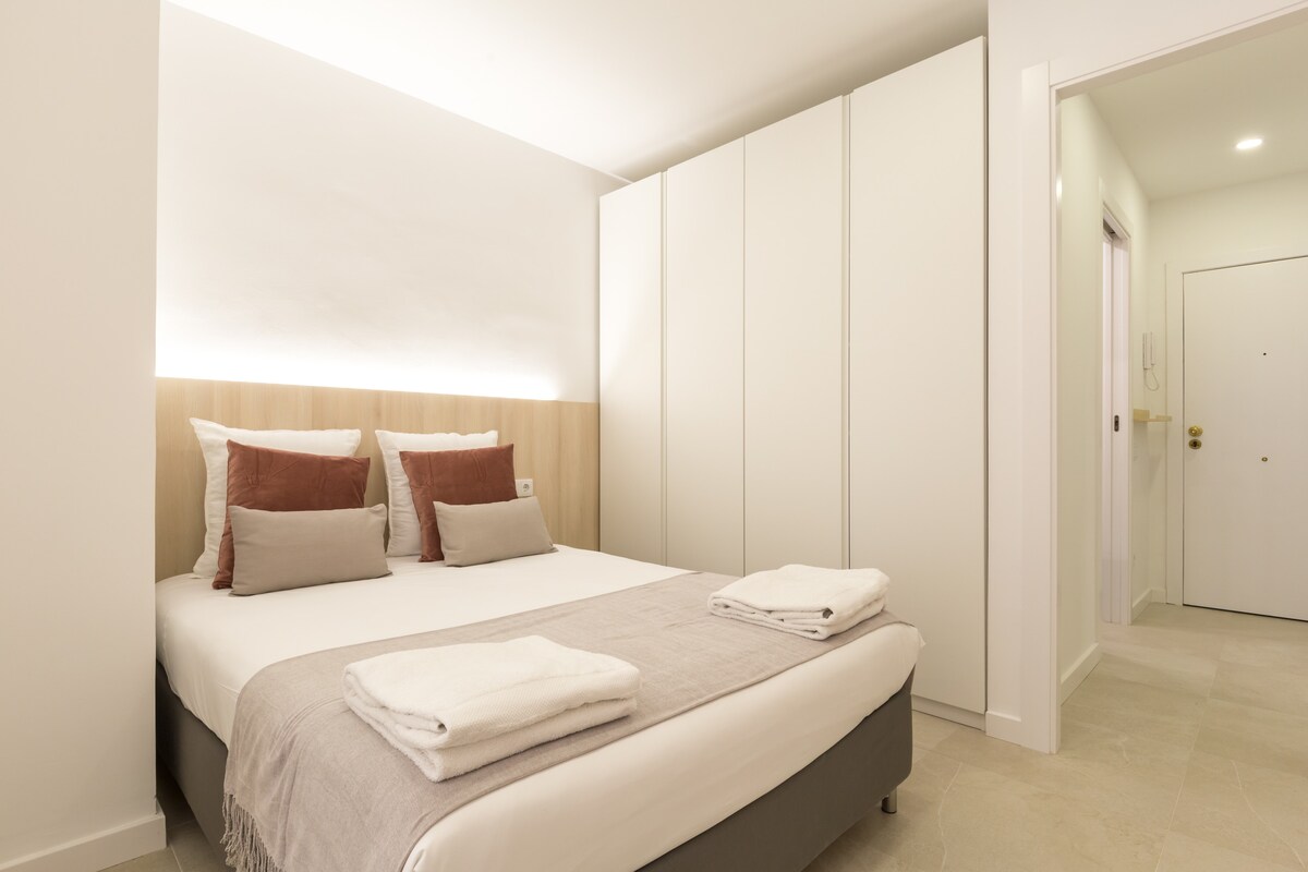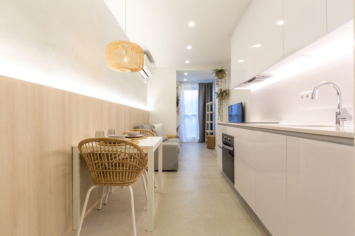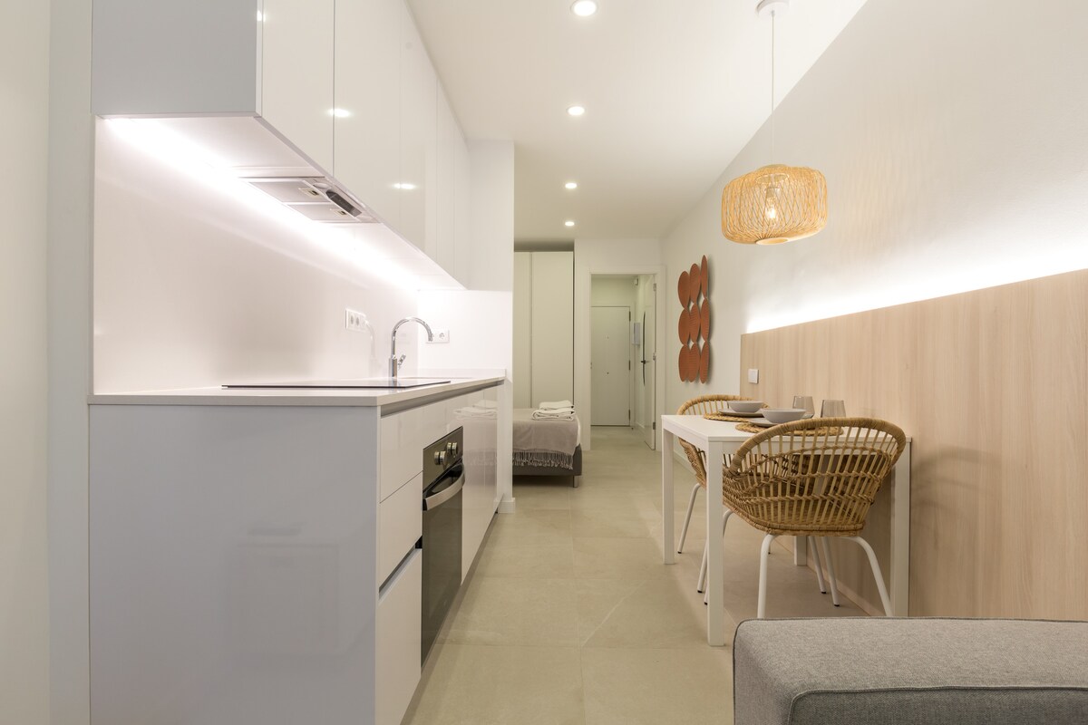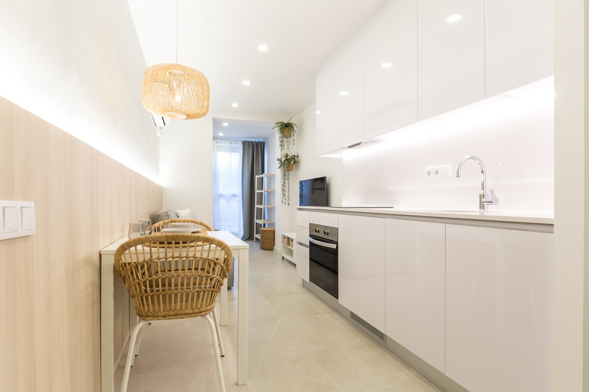 Cool marble floors combine with a sophisticated palette of glossy white and soft taupe for a chic finish. This fully furnished studios is the perfect retreat for any NOMAD to work remotely and discover Barcelona.