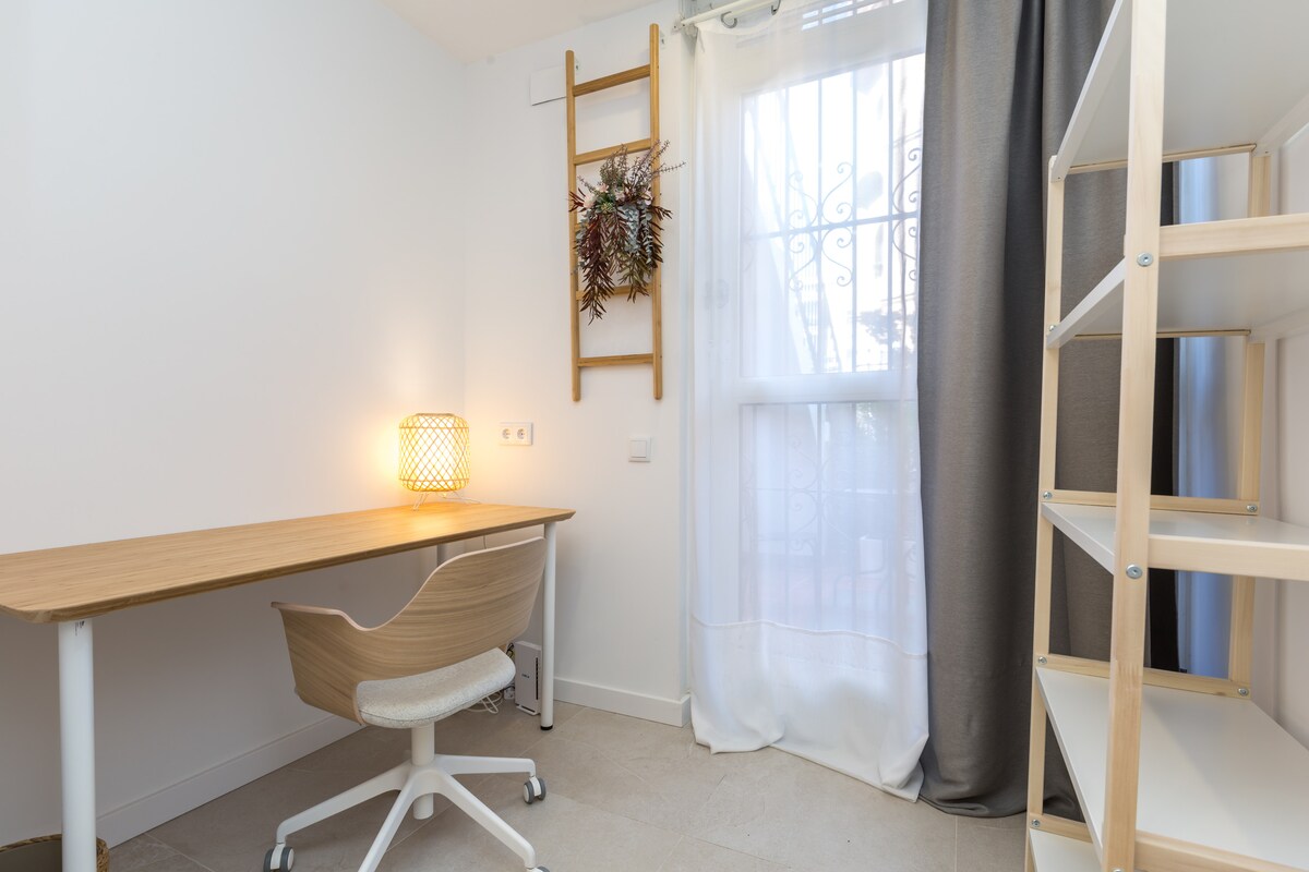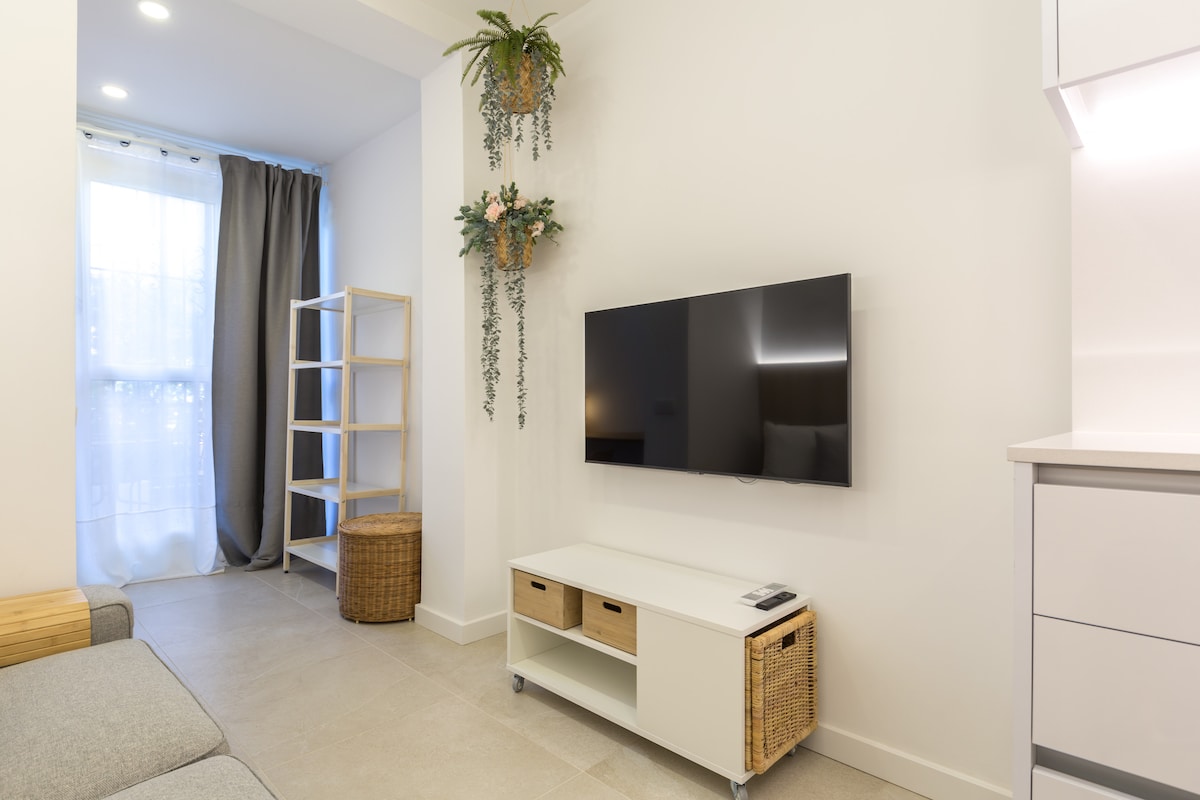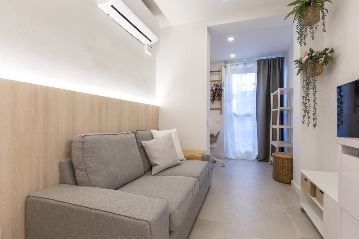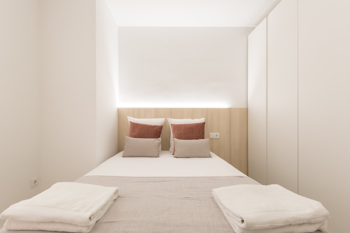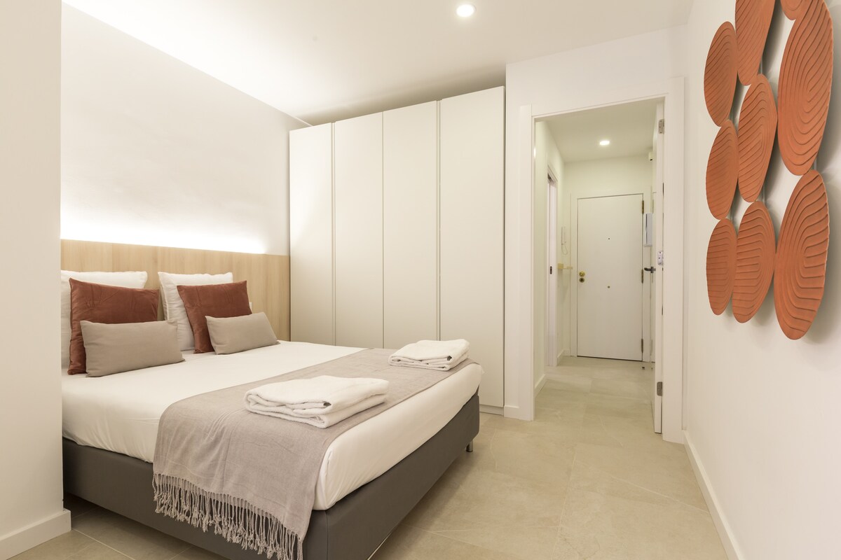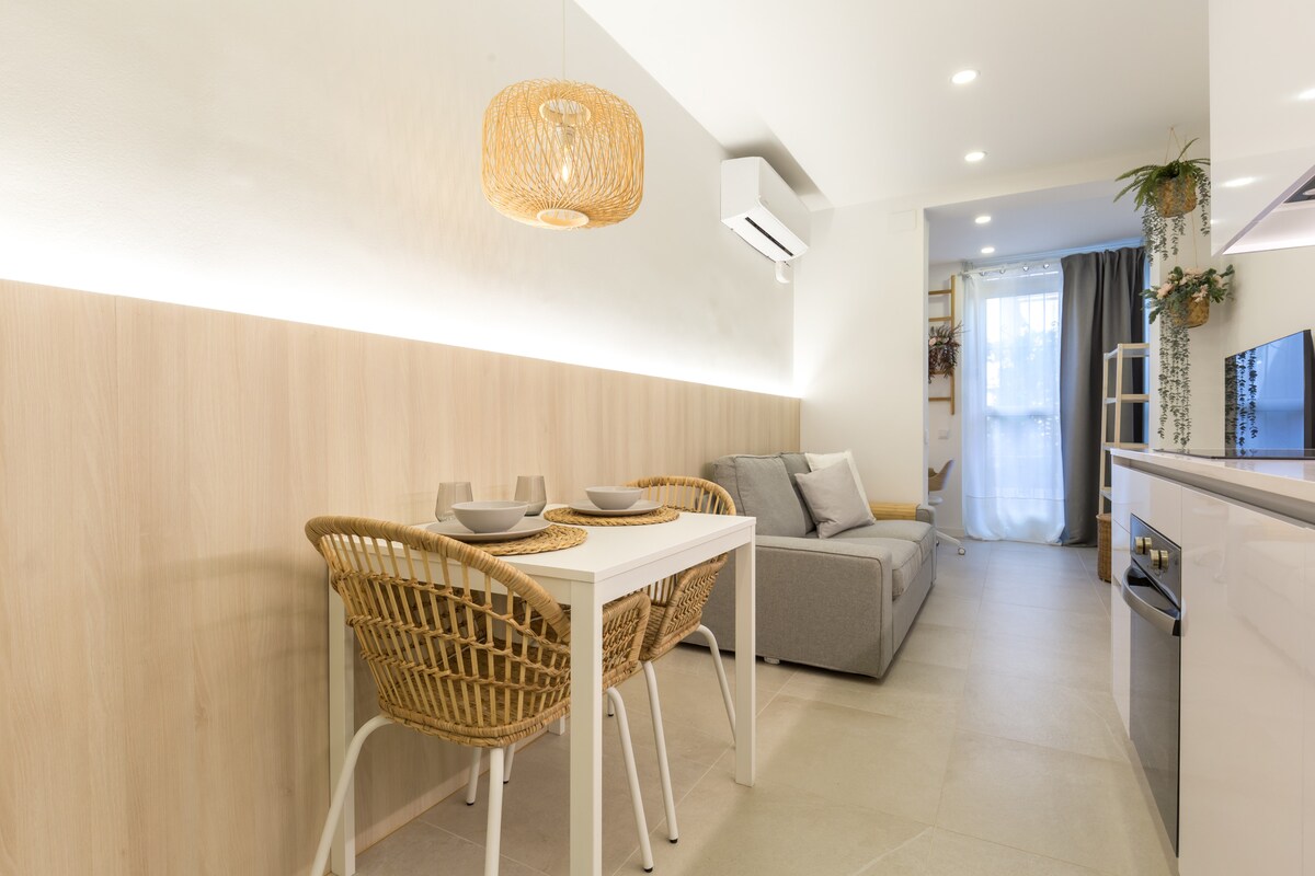 Cool marble floors combine with a sophisticated palette of glossy white and soft taupe for a chic finish. This fully furnished studios is the perfect retreat for any NOMAD to work remotely and discover Barcelona.