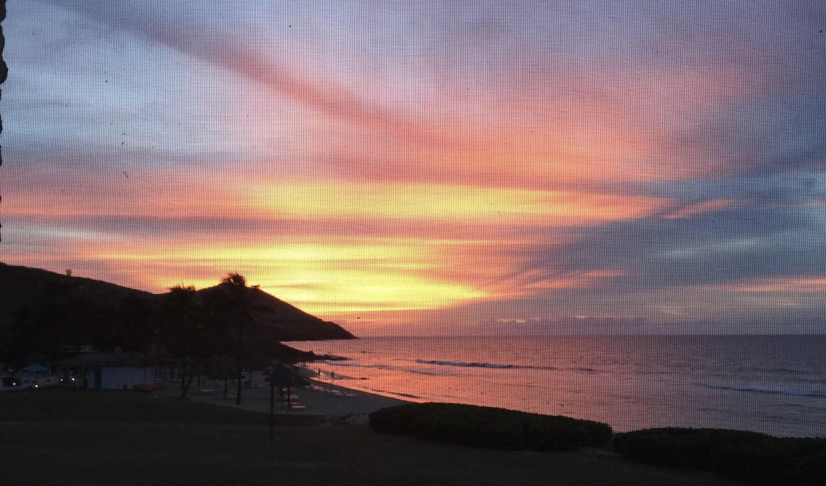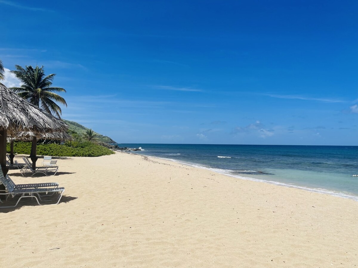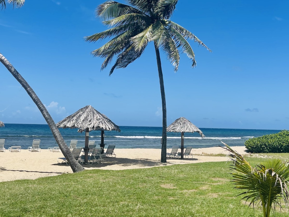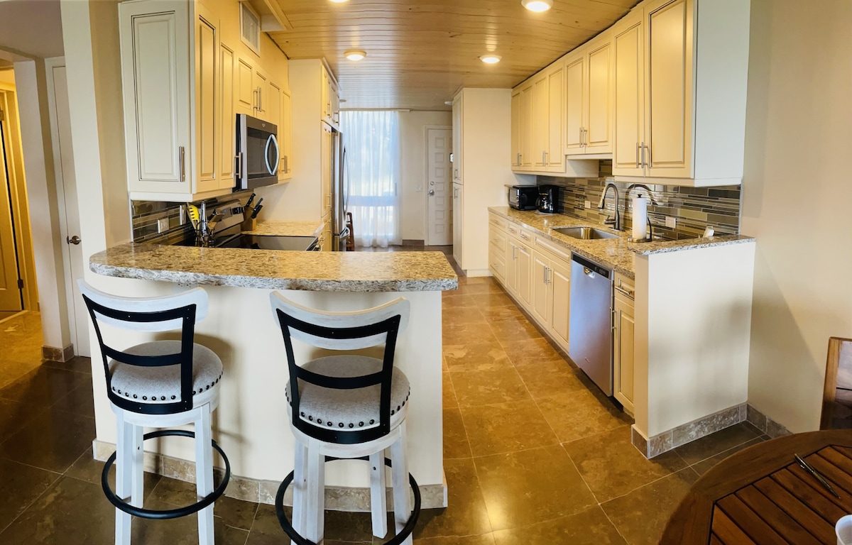 Recently renovated, this beachfront haven features two bedrooms, two bathrooms, and a fully equipped kitchen.
