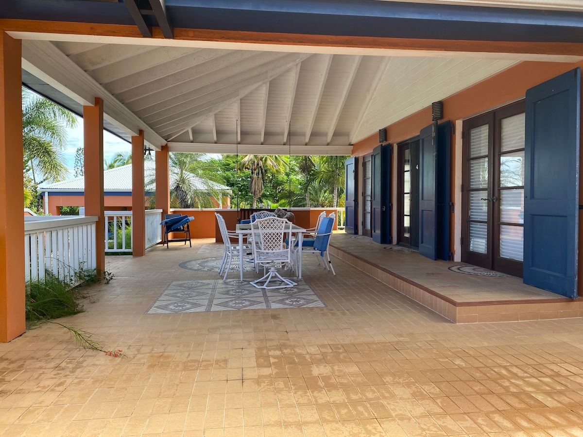 The large patio space is the highlight. There is a large dining room table and outdoor furniture protected by the roof. The patio extends to a large open-air space with a BBQ grill.