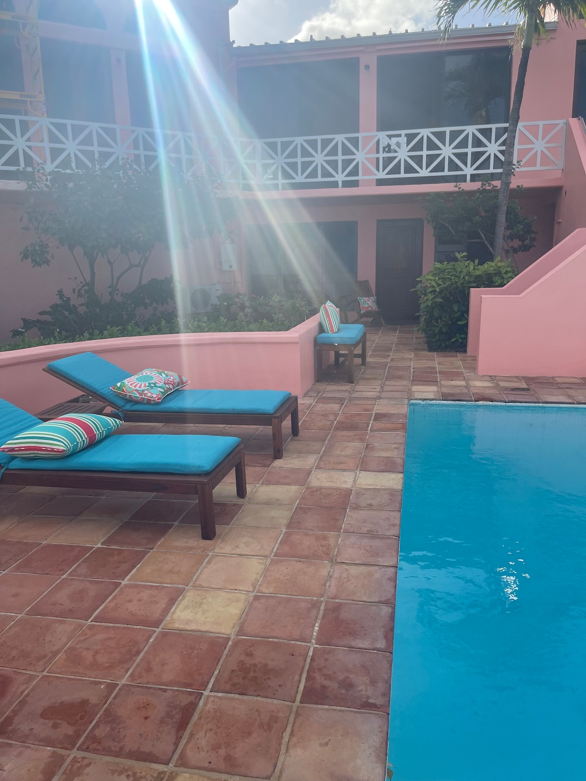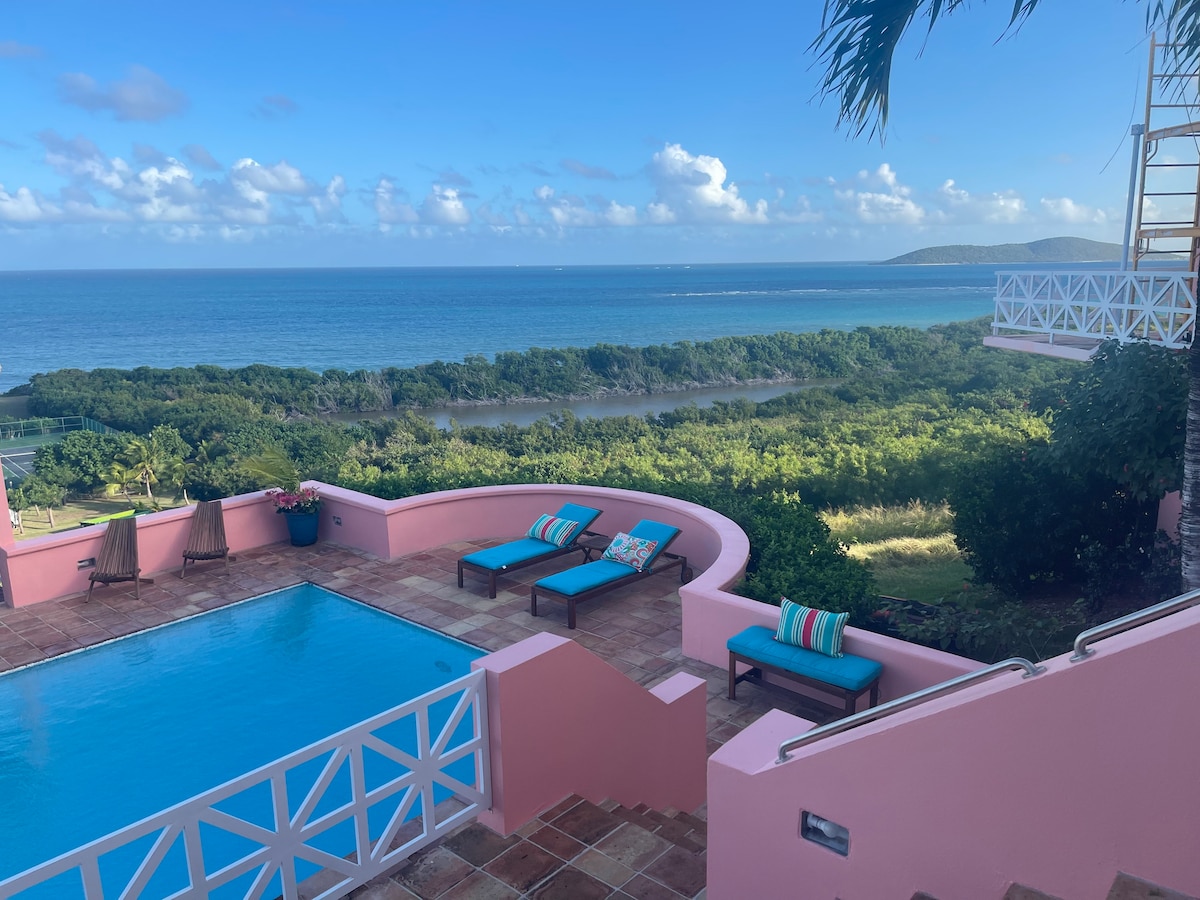 "Serenity Now" is suite 1 of 2 - 1 bd 1 ba private entrance on the garden/pool deck level of “The Big Pink House”. The suites open out to the large pool deck and poolside gazebo. Both have an ocean view from the room and are steps away from the tranquil heated swimming pool where you can delight in a swim 24 hrs. a day. No pool curfew here! We are one of the few pools on the island that has a solar cover with a reel & that includes the hotels. Surprisingly, swimming pools get chilly here in mid-Nov-March when our nights are in the 70's. Our pool is typically a balmy 84-86 degrees F year round."Blue Dream" is suite 2 of 2. Both are available to rent on Airbnb, if one is booked, please check availability of the other suite. You may also rent both for 4 guests via their individual booking sites on Airbnb. Search for “blue dreamstcroixusvi” or “serenitynowstcroixusvi”.
