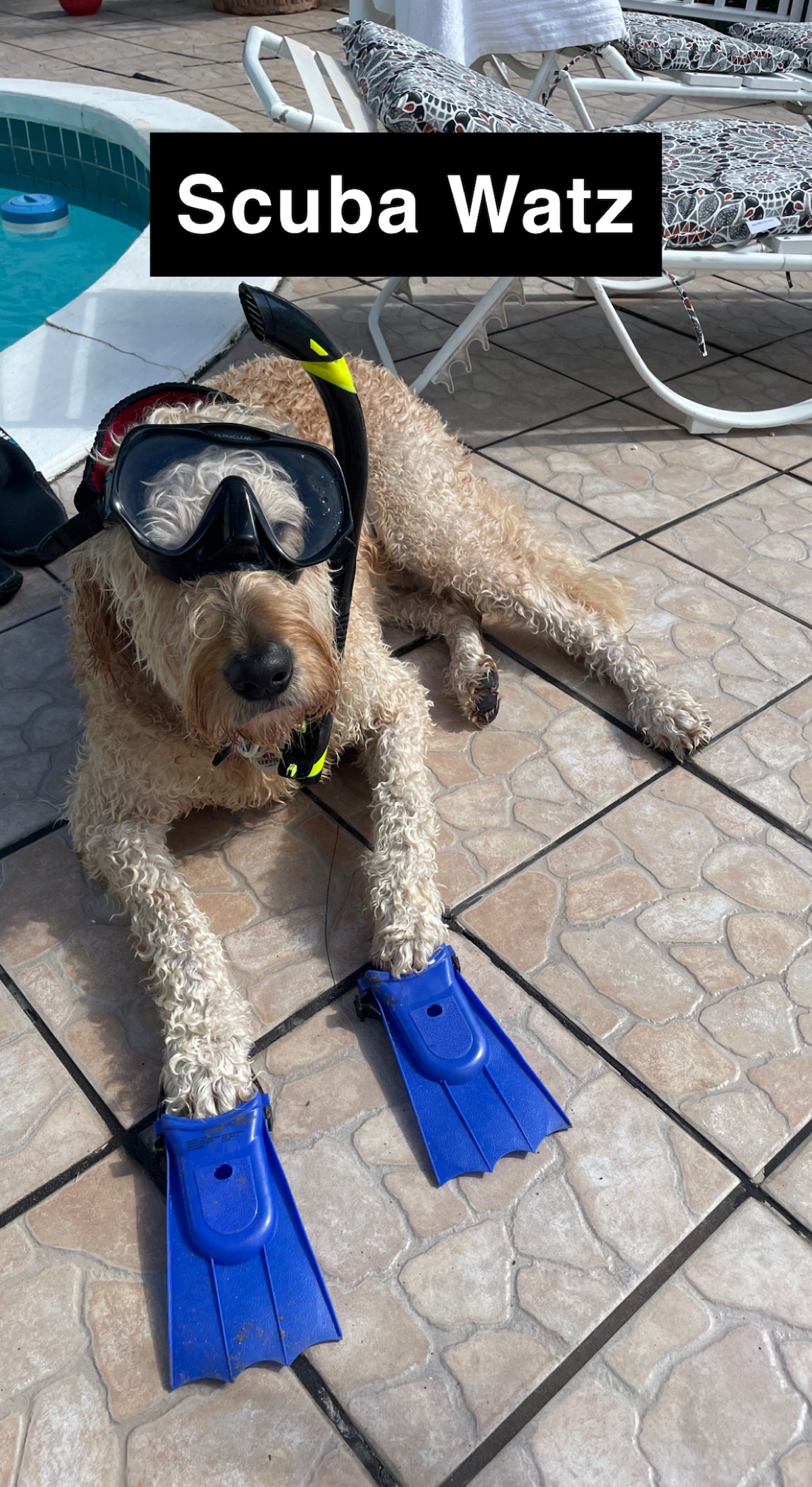 We have a Golden doodle named Watson who roams around the property who loves to play & swim! This is a must love dogs property. His alias is Scuba Watz. See him in the photos.